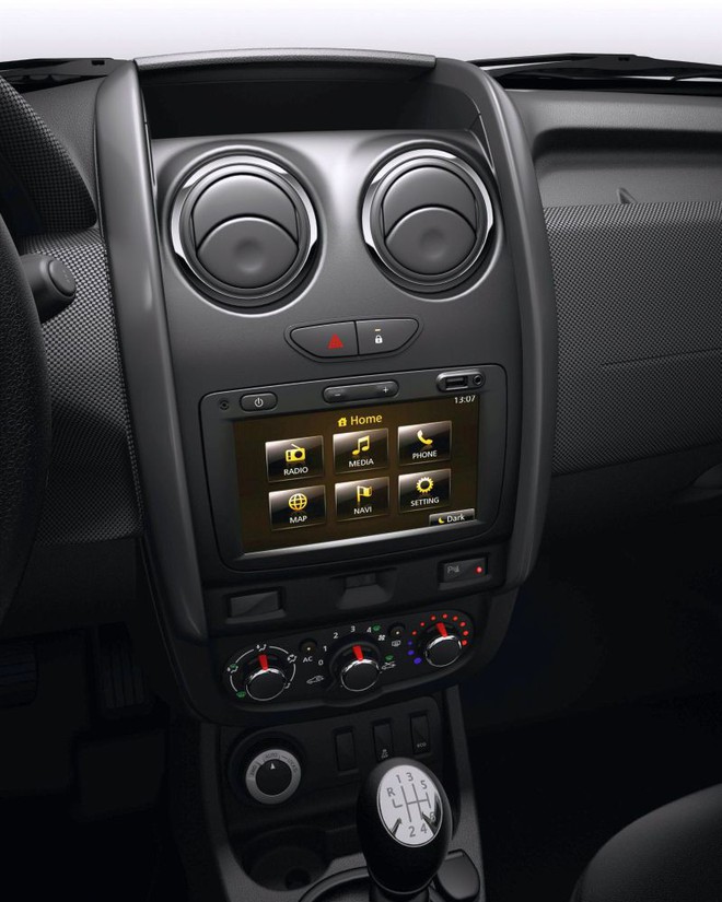 - Dacia MEDIA NAV, enostavno in intuitivno uporabna multimedijska in navigacijska naprava z velikim 7-palčnim (18 cm) zaslonom na dotik (glede na različico) ima jasno začetno stran menijev, s katerimi se upravlja številne funkcije. Med njimi sta brezžična povezljivost Bluetooth® in satelitska navigacija z dvo- in tri-razsežnostnim (Birdview) prikazom. Na čelni plošči sta vtičnici USB in jack, ki omogočata enostaven priklop prenosnih osebnih naprav.
