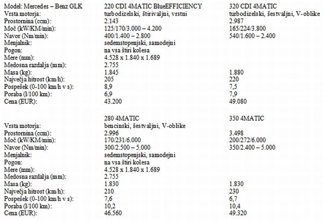 Mali SUV se ponaša s sedemstopenjskim samodejnim menjalnikom 7G-TRONIC, spredaj delno električno nastavljivimi sedeži, električnim pomikom stekel in dvopodročno klimatsko napravo. Ker pri Mercedes-Benzu veliko pozornosti namenijo varnosti, se tudi GLK ponaša s celo vrsto elektronskih pomagal za izboljšanje varnosti. Do aprila prihodnjega leta bo GLK pri nas na voljo zgolj v različicah 320 CDI ter 280 in 350, takrat pa se jim bo pridružil še 220 CDI BlueEFFICIENCY. Do konca leta bo po