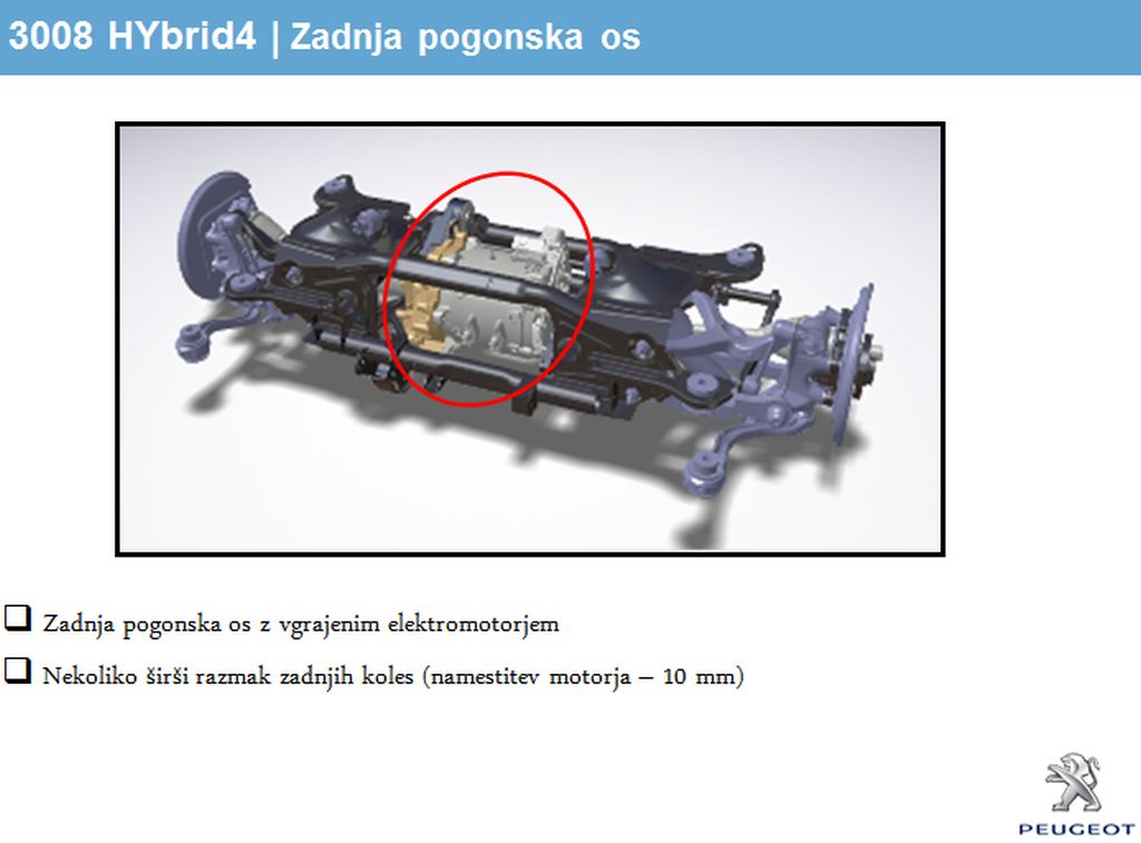 1966, ko so Francozi predstavili prvi velikoserijski izdelek te vrste, znan kot renault 16) in petvratnim enoprostorcem). Za to je zaslužna tehnologija HYbrid 4, ki predstavlja kombinacijo elektromotorja (delovna moč: 27 'konj' in 100 Nm motornega navora, največja trenutna moč: 37 'konj' ter 200 Nm motornega navora) in 2,0-litrskega HDi (163 KM pri 3750 vrt./min ter 300 Nm motornega navora pri 1580 vrt./min) agregata s skupno močjo 200 'konj' in 4-kolesnim pogonom, čeprav bo takšen peugeot