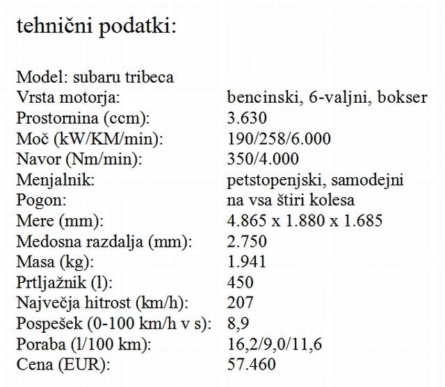 Subarujeva tribeca v leto 2008 prihaja brez oznake B9, ki je pripadala njeni, evropskim kupcem rahlo kontroverzni predhodnici. Ena možna izbira pogonskega agregata ter le ena možnost izbire menjalnika in opremljenosti. Sploh lahko kaj izbirate? Seveda, barvo laka karoserije! Pa še teh ni ravno veliko. A je zato vsega že takoj veliko.