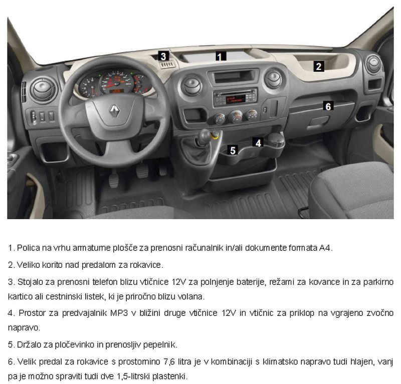 Največji prostor je 54-litrski predal pod sedalom sovozniške klopi. Ta ni predeljen, zato je vanj možno shraniti najrazličnejše raztresene drobnarije ali pa zajetne predmete. Ta rešitev, ki je bila preizkušena in s strani poklicnih uporabnikov zelo cenjena že v modelu Master, omogoča varno in pred radovednimi pogledi skrito shranjevanje opreme in orodja, kar poklicni uporabniki zelo cenijo.