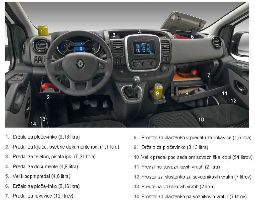Največ prostora za odlaganje in shranjevanje med modeli na trgu Novi Trafic ima skupno za več kot 90 litrov prostorov za shranjevanje in odlaganje, kar je največ na trgu. Vseh odlagalnih mest raznih oblik je 14, prostornina vsakega znaša od 0,2 do 54 litrov, prav vsa pa so zasnovana posebej za predmete, ki so del vsakdana poklicnih uporabnikov, na primer plastenke z vodo, pločevinke, kozarci, prenosni telefoni, tablični računalniki, bloki in pisala, delovne čelade, škornji itn. Vsa mesta so skrbno umeščena v bivalni prostor, njihov položaj pa je kar se da ergonomsko domišljen.