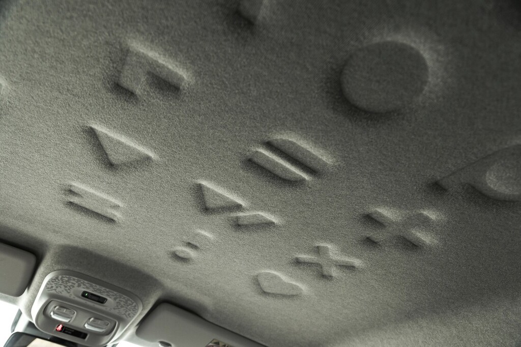 sive v črno in ima rdeče okrasne šive. Na drugi strani je obloga stropa okrašena z vtisnjenimi črkami nove pisave Twingo.