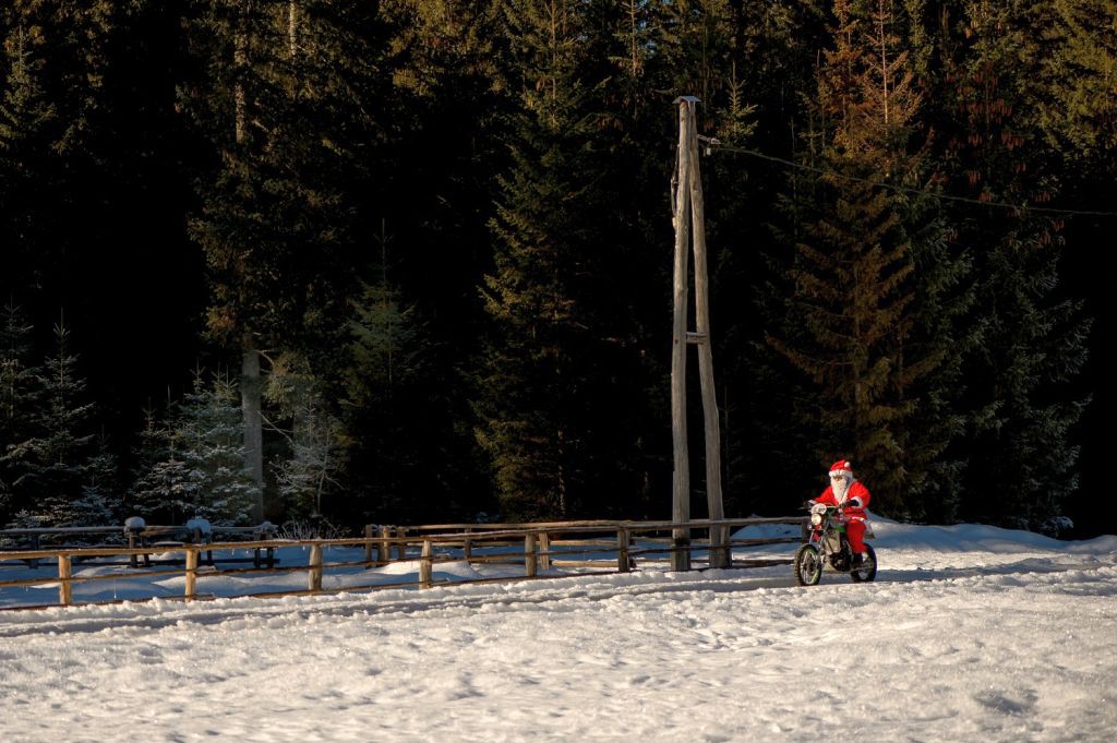 Prav tam pa smo naleteli na njegovega prijatelja ali pa, če tako želite, tekmeca, Božička, ko se je sproščal v vožnji z motociklom. Očitno se tudi Božiček zaveda, da si je pred velikanskim izzivom, ko bo moral v eni noči obiti in obdariti vse otroke sveta, dobro malce sprostiti glavo in napolniti baterije.