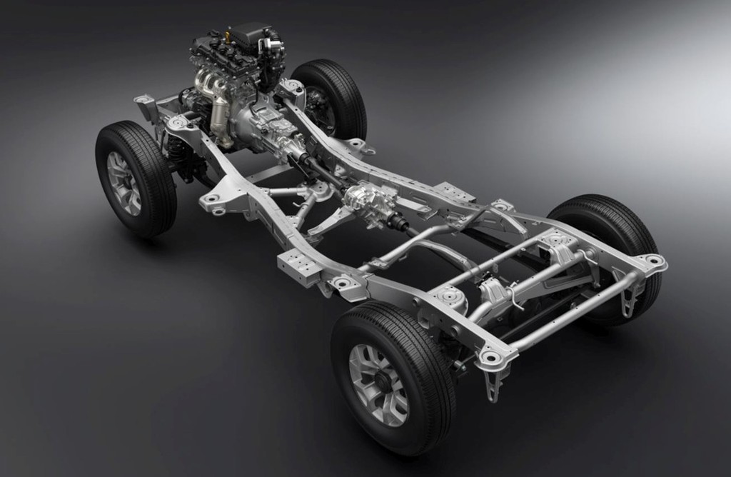 Novinec se lahko ob primerjavi z aktualnimi primerki pohvali tudi z dodatnimi 53 litri prostornine v prtljažnem prostoru, ker lahko novi jimny ob podrtem paru zadnjih sedežev sprejme 377 litrov tovora, odnosno 85 litrov v primeru, ko so v vozilu štirje potniki. Več transportne uporabnosti od vozila, ki meri v dolžino samo 3480 mm (3645 mm v primeru nameščenega rezervnega kolesa na zadku), niti ne moremo pričakovati. Lahko pa pričakujete zvrhano mero agilnosti in okretnosti, ker je novi jimny tudi lahek (minimalna neto masa vozila: 1090 kg), ponuja pa tudi 345 kilogramov uporabne nosilnosti. Dobre terenske zmogljivosti pa podpira tudi tehnika, ker je Jimnyjeva karoserija nasajena na klasično letvasto šasijo (ladder frame structure) v kombinaciji s parom togih prem, ki sta podprti z vijačnimi vzmetmi in s po tremi vodili. Za dober stik z vozno podlago pa seveda poskrbi priklopljiv štirikolesni pogon z reduktorjem (razpoložljivi načini vožnje: 2H (2WD-high gear), 4H (4WD-high gear) in 'plezalni' 4L (4WD-low gear)) v navezi s kompletom terensko orientiranih 15-pačnih pnevmatik (195/80 R15).