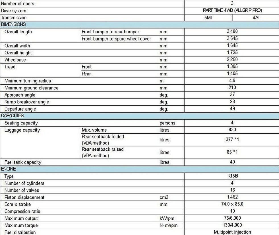 Sedaj so Japonci razkrili nekaj novih tehničnih in ostalih detajlov, povezanih tudi z evropsko različico tega priljubljenega terenskega vozila, ki tudi v zadnji izdaji cilja predvsem na podporo potencialnih kupcev iz sveta profesionalnih uporabnikov terenskih vozil, temu primerno pa je prilagojeno tudi izredno funkcionalno usmerjeno oblikovanje tega kultnega japonskega terenskega malčka. Ob tem so Suzukijevi oblikovalci ponovno stavili predvsem na preprosto, vendar zelo efektivno (v pogledu praktičnosti in uporabnosti) klasično oblikovanje terenskih vozil, ki je zaznamovalo tudi vse dosedanje serijske predstavnike tega modela. Posledično se je že prvi jimny (serija LJ (1970-1976)) lahko pohvalil tudi z odlično preglednostjo iz vozila, predvsem po zaslugi 'škatlasto' oblikovane karoserije, ki vozniku istočasno lahko olajša manevriranje, za razliko od zaobljenih modernih avtomobilov, kjer ob parkiranju o tem, kjer je zaključek avtomobilske karoserije lahko samo ugibate …