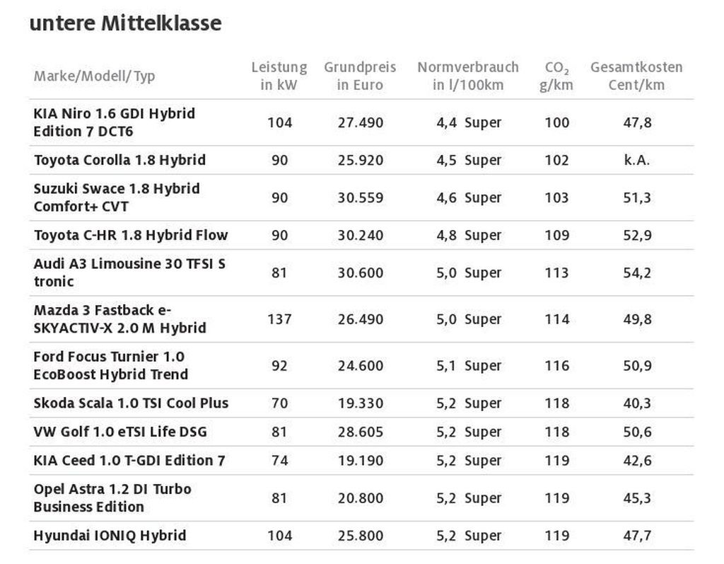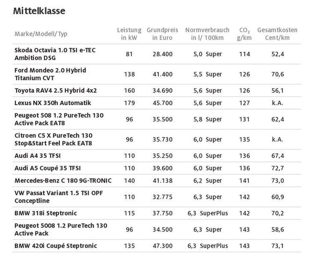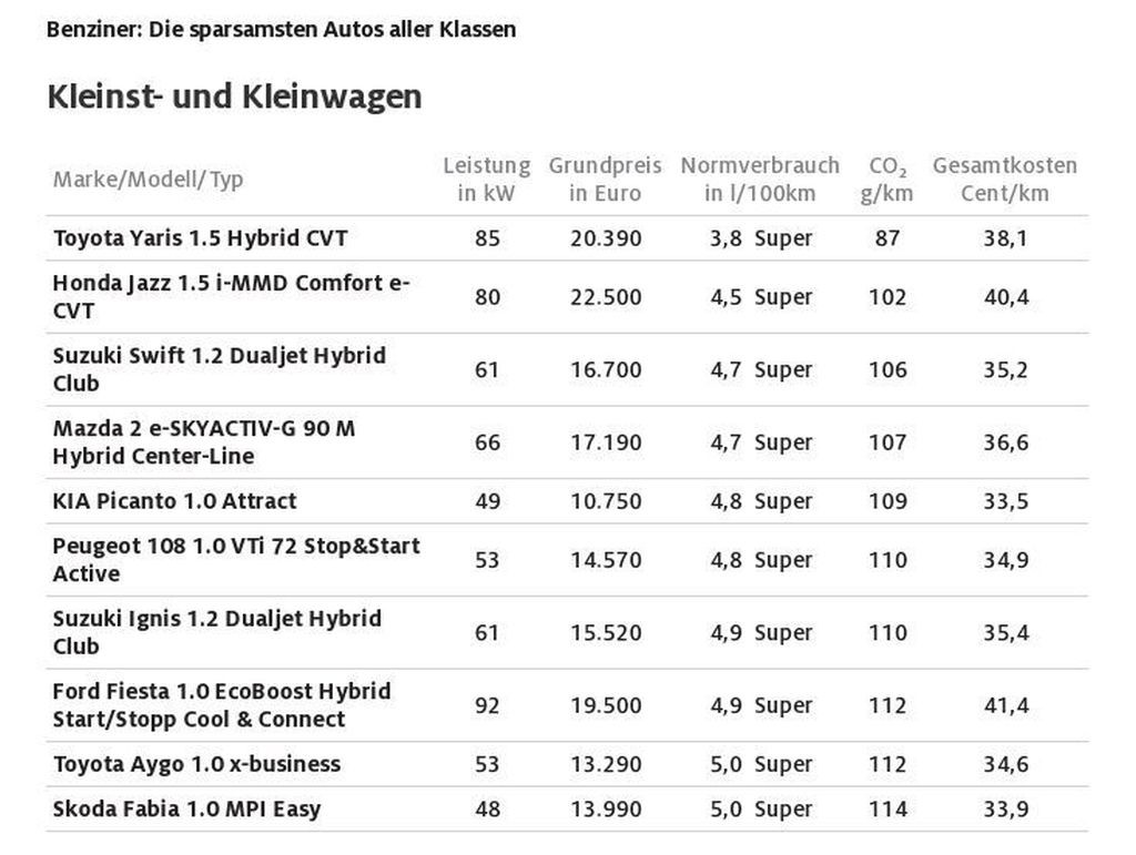 Z naslovom trenutno najbolj varčnega (povprečna WLTP poraba na 100 km: 3,8 litra) bencinsko gnanega avtomobila se trenutno lahko okiti resnično kompaktni izdelek znamke Toyota (model yaris 1.5 hybrid (85 kW) CVT), ki je istočasno tudi najbolj ekološko vozilo (CO2 g/km: 87) na tem seznamu. Zelo dobro je ocenjena tudi škoda fabia 1.0 MPI easy (48 kW), vendar ne v pogledu poprečne porabe (l/100 km: 5) in ekologije (CO2 g/km: 114), temveč v pogledu najnižjih stroškov lastništva. V ta obračun so Nemci vključili veliko dejavnikov (60 mesecev lastništva, 15.000 letno prevoženih kilometrov, zavarovanje in registracija vozila, izguba vrednosti brez obresti, strošek servisiranja in nakupa novih pnevmatik ter aktualne nemške prodajne cene goriva (1. liter bencinskega goriva: 1,7 evra, 1. liter superplus bencina: 1,79 evra, 1. liter dizelskega goriva: 1,54 evra)).