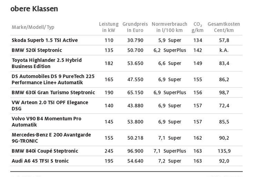 Strokovnjaki kluba ADAC so pripravili nove preglednice trenutno najbolj z gorivom varčnih bencinsko gnanih avtomobilov na nemškem tržišču. Tokrat se je na 4 preglednice uvrstilo 45 najmanj 'žejnih' serijskih modelov avtomobilov, ocenjenih na podlagi protokola WLTP.