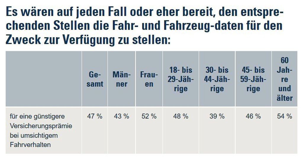 Na takšen kompromis bi pristalo 47 odstotkov vseh vprašanih Nemcev in Nemk, ki so sodelovali v tej raziskavi. Ta ideja je zelo všeč ženskam, ker je 52 odstotkov sodelujočih žensk odgovorilo, da bi odstopile podatke o telemetriji v slučaju finančnega prihranka ob zavarovanju vozila. Manj dovzetni za to idejo so moški (to idejo podpira samo 43 % izmed vseh vprašanih).