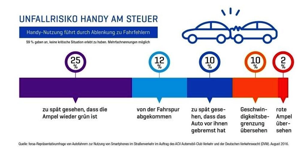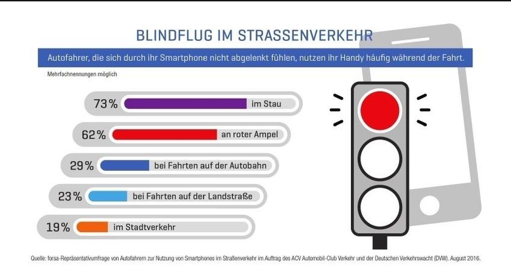 62 odstotkov izmed vseh vprašanih je ob tem povedalo, da mobilni ali pa pametni telefon uporabijo samo takrat, ko se znajdejo v prometnih zamaških ali pa v počasi se odvijajočem prometu, 56 odstotkov izmed vseh vprašanji je to storilo ob čakanju pred semaforjem, ko je bila prižgana rdeča luč. Samo 12 odstotkov izmed vseh vprašanih (ne glede na starost) je pravih 'smartphone odvisnikov', ker ga uporabljajo v vseh situacijah v mestnem prometu. Nekoliko več (14 %) aktivnih uporabnikov najdemo ob vožnjah po podeželskih in regionalnih cestah, največ aktivnih uporabnikov (17 %) IT naprav med vožnjo avtomobila pa kroži po nemških avtocestah. Profesor Kurt Bodewig, predsednik organizacije DVW, je mnenja, da počasi prihaja čas, ko bo takšno početje nekaterih voznikov pri visokih hitrostih, ki odvrača pozornost voznika od resničnega dogajanja na cesti, potrebno ostreje sankcionirati, ker v teh primerih ne gre več za 'kavalirski delikt', temveč za povzročanje smrtne nevarnosti za vse ostale udeležence v prometu …