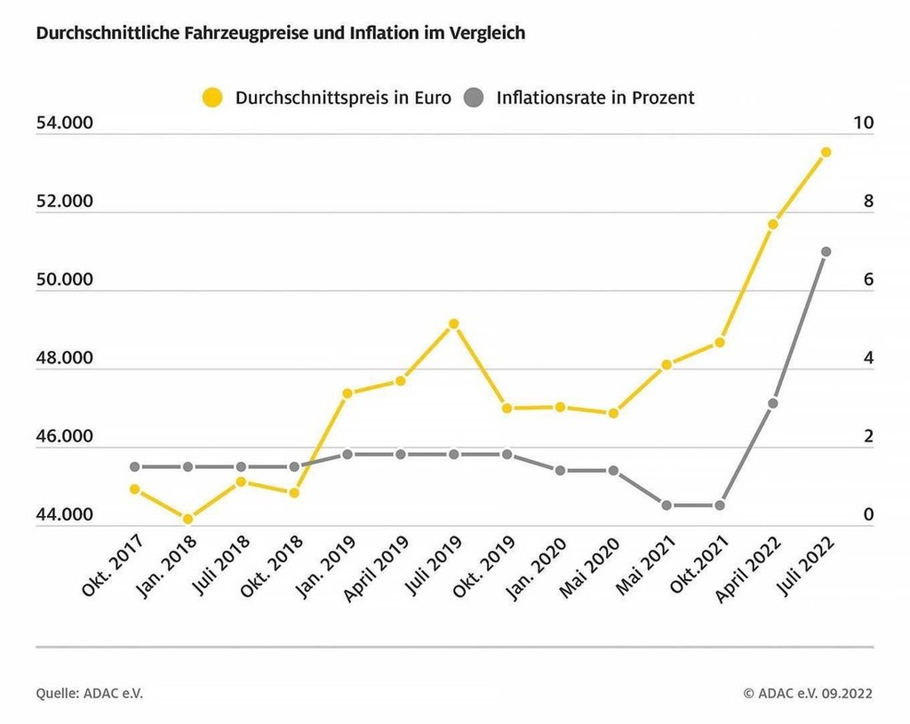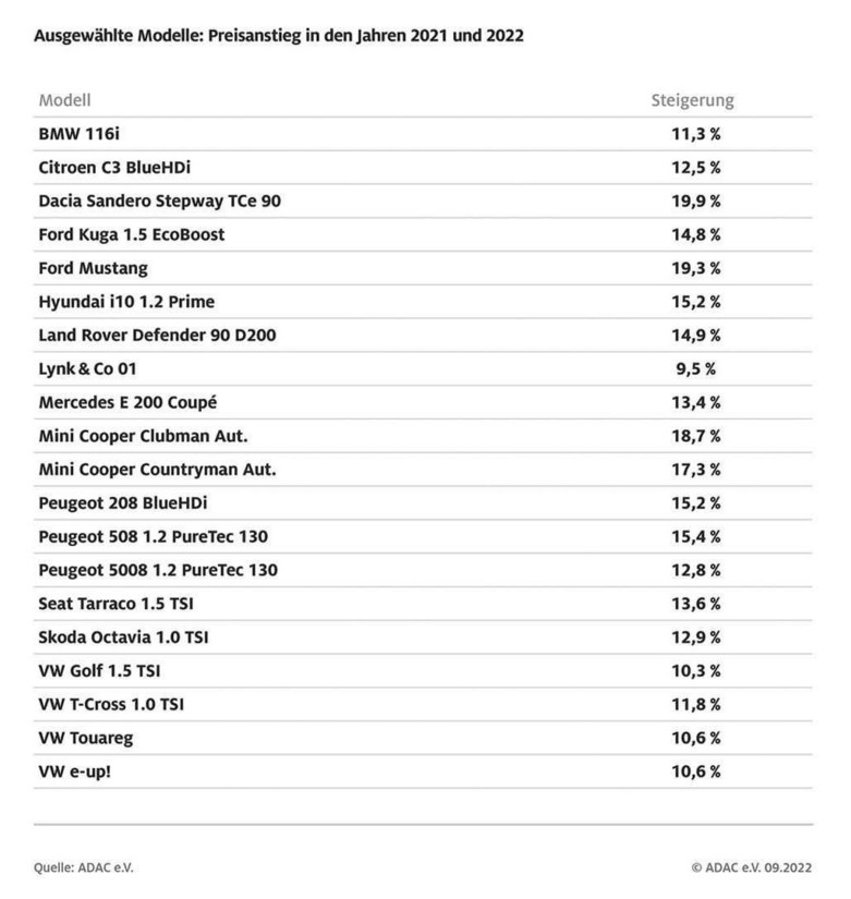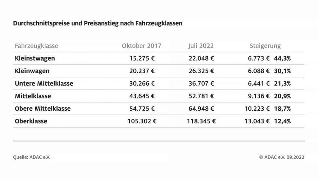 Žal izsledki kluba ADAC kažejo ravno na to, da nas prodajalci novih avtomobilov čedalje bolj 'ožemajo', ob tem pa 'revčki' tarnajo, da jim je padla prodaja novih avtomobilov, nekateri bi celo potrebovali pomoč države. Po drugi plati se pa nekateri proizvajalci avtomobilov hvalijo z doseženimi poslovnimi rezultati v zadnjem času … Strokovnjaki kluba ADAC so primerjali opremo in prodajne cene novih avtomobilov v obdobju od leta 2017 do sedaj in ugotovili, da so se novi avtomobili v zadnjih petih letih na nemškem tržišču v povprečju (glede na razrede vozil …) podražili za neverjetnih 44 odstotkov, in to večinoma s popolnoma enako opremo in stopnjo motorizacije. Leta 2017 ste za povprečno vredno novo vozilo odšteli 44.908 evrov, v juliju leta 2022 ste morali za enako opremljen in enako motoriziran model odšteti 53.525 evrov. V povprečju so se novi avtomobili podražili za slabih dvajset odstotkov (ob upoštevanju 8-odstotne inflacije).