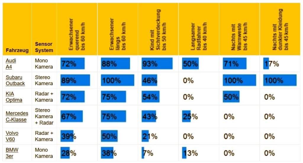 Pri največjem nemškem avtomobilskem klubu so tokrat vzeli pod drobnogled 6 aktualnih serijskih modelov (audi A4, BMW serija 3, KIA optima, mercedes-benz razred C, subaru outback in volvo V60) iz evropskega srednjega razreda, ker gre v tem primeru za avtomobile, ki so večinoma že serijsko opremljeni z različnimi asistenčnimi sistemi za zaznavanje pešcev in kolesarjev. Splošno gledano Nemci niso najbolj zadovoljni z delovanjem teh sistemov, navdušila sta jih edino sistema, ki sta vgrajena v audi A4 in v subaru outback, medtem ko jih je sistem iz volva V60 popolnoma razočaral, predvsem zaradi njihovih velikih pričakovanj glede legendarne varnosti vozil znamke Volvo, ki žal niso takšna kot jih oglašuje avtomobilski marketing in nekateri 'neodvisni' novinarji.