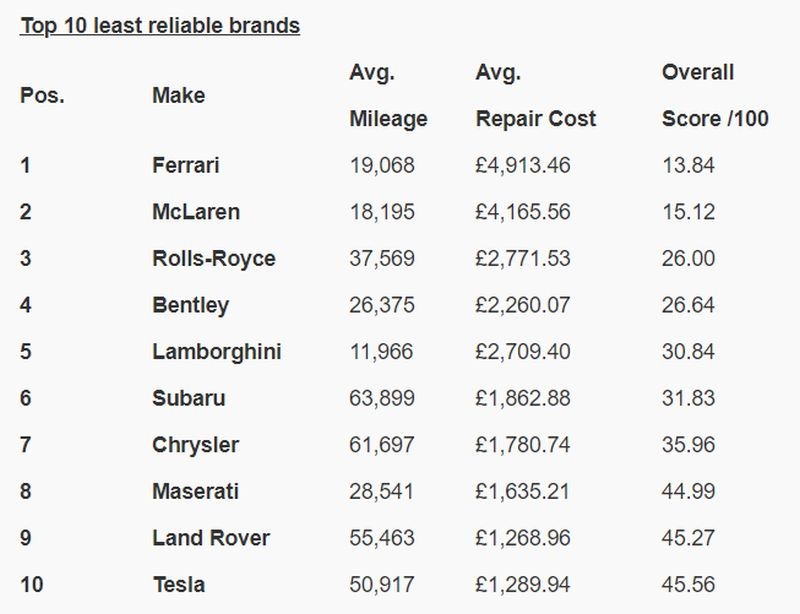 Čeprav bi v skladu z 'miti, bajkami in legendami', ki veljajo pri nas na Balkanu, pričakovali, da se bodo na lestvici najmanj zanesljivih modelov avtomobilov znašli predvsem štirikolesniki italijanskih in francoskih znamk, se motite, ker so jo tudi tokrat okupirali predvsem predstavniki nemških, britanskih, ameriških in celo en predstavnik japonskih avtomobilskih znamk (Mazda), ki so sicer znane po zelo zanesljivih serijskih modelih. Tega očitno ne moremo več reči za znamko Subaru, ker se je tokrat uvrstila na 'sramotilni steber' z imeni desetih, splošno najbolj pokvarljivih avtomobilskih znamk, kjer sicer kraljuje znamka Ferrari, takoj za petami ji je v tem pogledu znamka McLaren, pokvarljivi 'Trio Fantastikus' pa v tem primeru dopolnjuje znamka Rolls-Royce. V pogledu odlične zanesljivosti znamk pa znova ni presenečenj, ker prva štiri mesta zasedajo japonske avtomobilske znamke (Honda, Lexus, Toyota in Suzuki). Veliko večje presenečenje je peto mesto znamke Dacia, sploh ob primerjavi s sorodstvom (Renault), ki je sicer tudi na lestvici do uporabnika 'zelo prijaznih' znamk, vendar je tokrat pristala šele na desetem mestu.