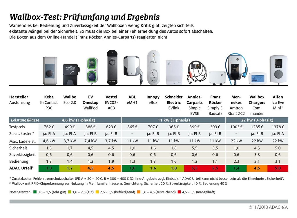 Najboljšo možno oceno („sehr gut“ / zelo dobro) so si prislužile samo tri testirane stenske polnilnice (KEBA KeContact P30 (nemška prodajna cena: 762 evrov), ABL eMH1 (865 evrov) in MENNEKES AMTRON Xtra 22 C2 (1.903 evrov)), malenkostno slabšo oceno („gut“ / dobro) so si prislužili še trije takšni izdelki (WALLBE Eco 2.0 (499 evrov), INNOGY eBox (707 evrov) in SCHNEIDER-ELECTRIC EVlink (965 evrov)), na nakup katere izmed preostalih slabše ocenjenih testiranih polnilnic pa po nemškem mnenju raje pozabite …