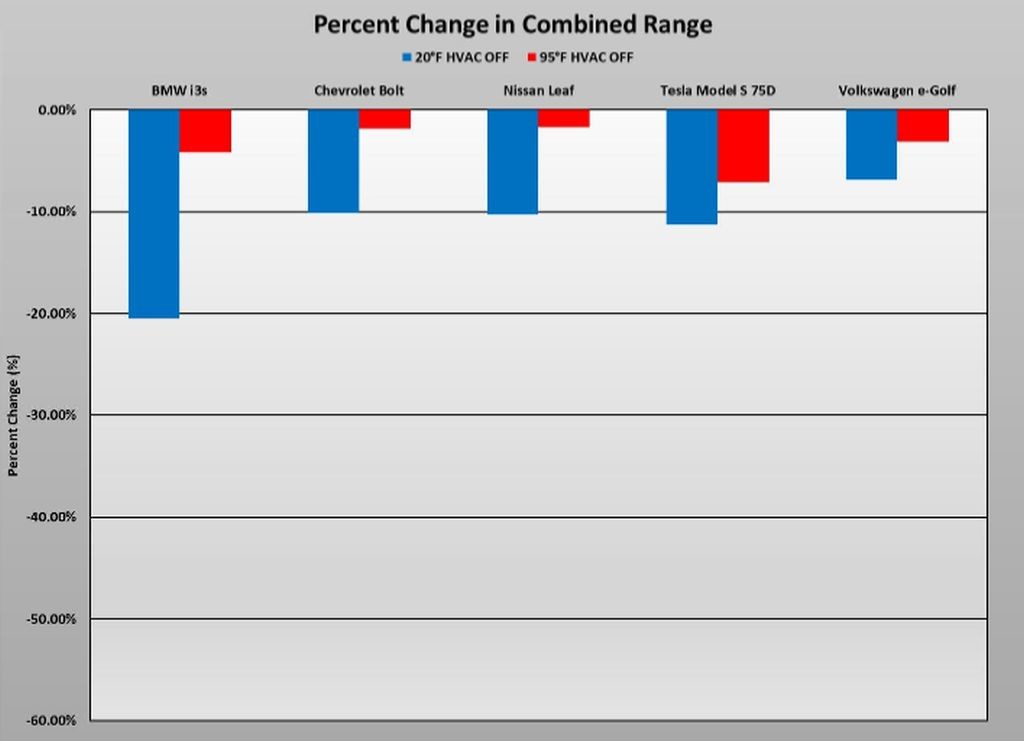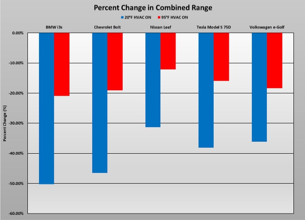 Tokratna ameriška raziskava je zelo temeljita, ker so Američani preizkusili 5 serijskih modelov aktualnih električnih vozil v treh različnih temperaturnih okoljih in na koncu ugotovili, da lahko ob zimskih vožnjah z električnimi avtomobili računate na približno 40 odstotno splošno zmanjšanje akcijskega dosega s samo enim polnjenjem akumulatorjev. To postavko, ki predstavlja predvsem posledico razvajenosti kupcev sodobnih avtomobilov, morajo ob nakupu njim primernega električnega avtomobila obvezno upoštevati vsi potencialni kupci takšnih avtomobilov. Na teh testiranjih pri različnih temperaturah (- 7, 24 in 35 stopinj Celzija) je sodelovalo 5 serijskih avtomobilov (BMW i3s (2018), chevrolet bolt (2018), nissan leaf (2018), tesla model S 75D (2017) in volkswagen e-golf (2017)), ki so trenutno na voljo kupcem v ZDA, so se pojavile občutne razlike v akcijskem dosegu, istočasno so Američani preračunali tudi vse stroške za vsakih 1000 milj (1609 km), ki jih bodo deležni lastniki takšnih avtomobilov.