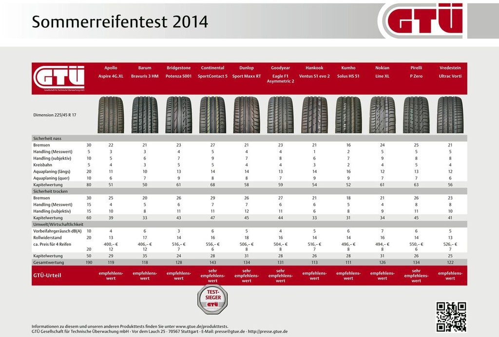 Nemška organizacija GTÜ (Gesellschaft für Technische Überwachung mbH) in drugi največji nemški avtomobilski klub ACE (Auto Club Europa) sta včeraj objavila rezultate testov enajstih različnih letnih pnevmatik, ki so na voljo v nemških trgovinah. Tokrat so testirali pnevmatike v dimenzijah 225/45 R 17.