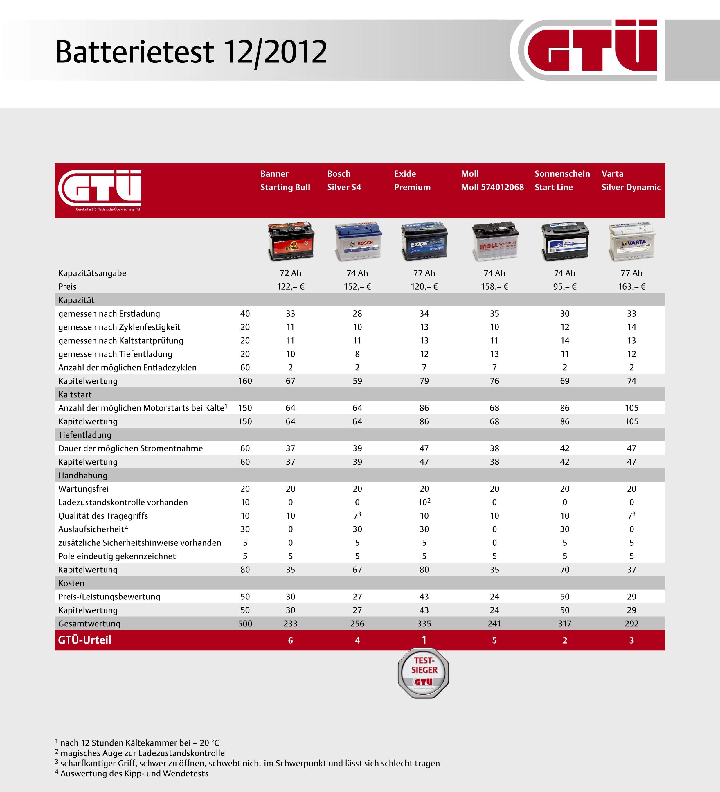 Pri tem so Nemci na koncu dobili dva zmagovalca te 'ledene bitke', ker prihaja eden izmed obeh zmagovalcev iz vrst klasičnih svinčenih akumulatorjev, drugi zmagovalec pa je predstavnik novejših in dražjih hermetično zaprtih AGM (Absorbent Glass Mat) akumulatorjev. Med klasičnimi akumulatorji se je na tem testu najbolje obnesel izdelek znamke Exide. Njihov 77-amperski model 'Premium' (120 evrov) je blestel v skoraj vseh kategorijah, posebej pa je navdušil v kategoriji Handhabung (rokovanje, vzdrževanje, navodila za uporabo, kvaliteta izdelave, varnost…), kjer je osvojil največje možno število točk (80).
