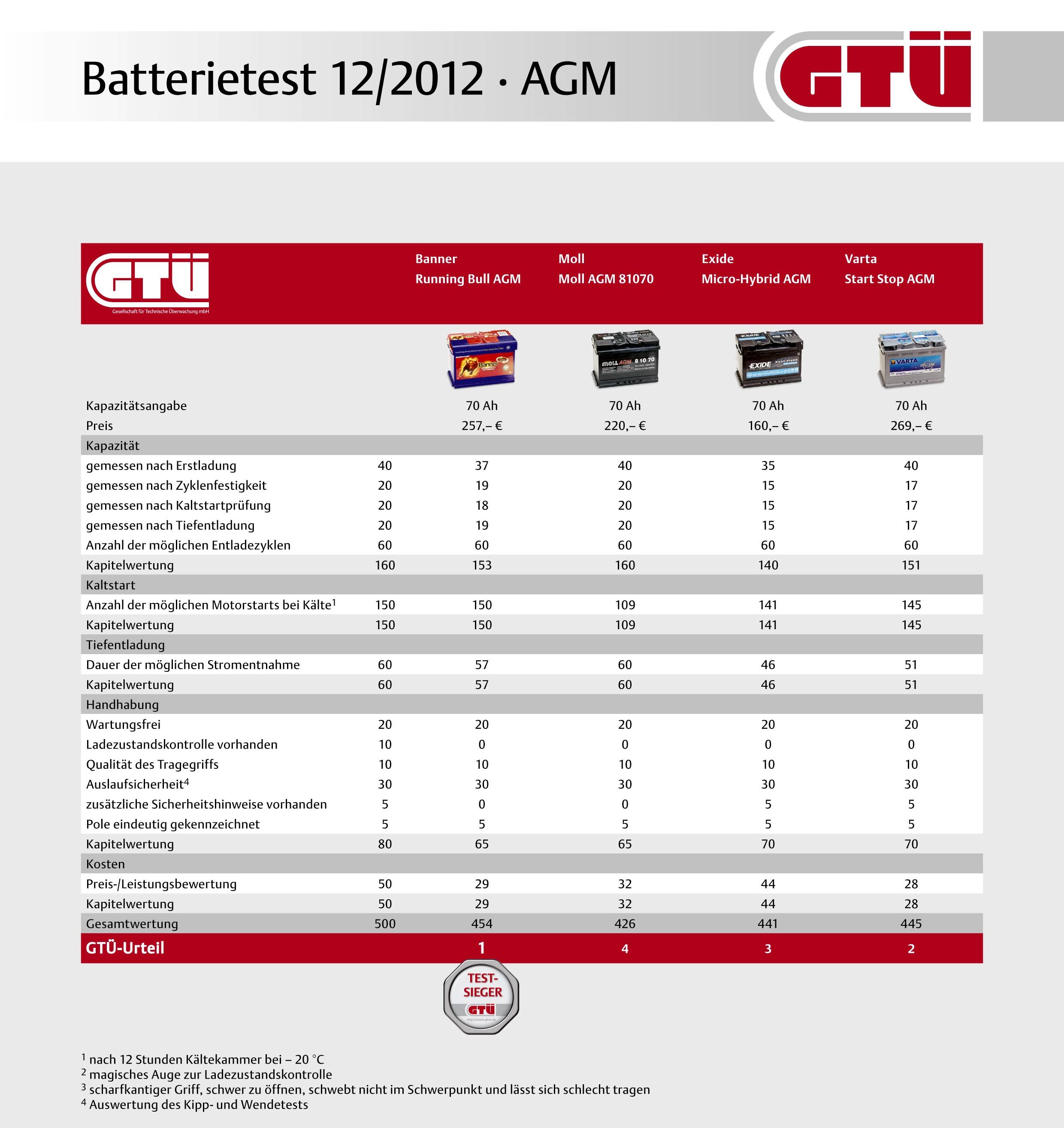 Med tehnološko bolj naprednimi AGM akumulatorji, ki so lahko precej dražji od klasičnih akumulatorjev, je blestel izdelek podjetja Banner, ki s klasičnim akumulatorjem na tem testu ni prepričalo Nemcev. Pri dražjih AGM akumulatorjih pa so pokazali svoje znanje, ker je njihov 70-amperski Running Bull AGM (257 evrov) prepričal Nemce z največjim možnim številom vžigov (33 zagonov motorja pri temperaturi -20 stopinj Celzija v časovnem obdobju dvanajstih ur). Na drugem mestu med AGM izdelki je pristal Vartin 70-amperski Start Stop AGM (269 evrov), tretji je Exide Micro-Hybrid AGM (160 evrov). Vseh deset testnih kandidatov pa izpolnjuje vse kriterije glede obljubljene življenjske dobe.