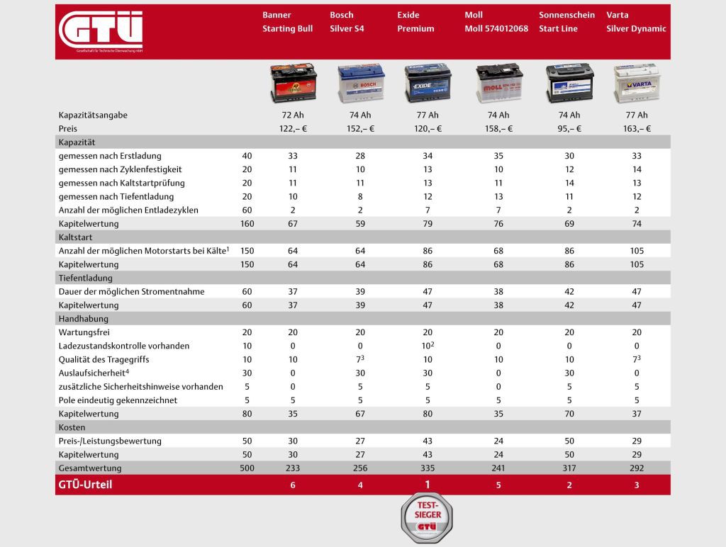 Neodvisna nemška strokovna organizacija GTÜ (Gesellschaft für Technische Überwachung mbH), ki deluje predvsem v interesu potrošnikov, je v teh dneh objavila rezultate nedavno opravljenih laboratorijskih testiranj desetih akumulatorjev, ki so jih opravili skupaj z novinarji nemške revije Auto Zeitung.