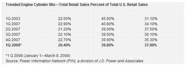 odstotni tržni delež. V času od leta 2003 do letošnjega leta se je zmanjšala (-5,8 %) prodaja avtomobilov s šestvaljnimi motorji, ki sedaj dosegajo le še 38,8 odstotkov tržnega deleža. Seveda so jo v sedanjih razmerah najslabše odnesli tradicionalni ameriški uničevalci fosilnih goriv, opremljeni z osemvaljniki. Njihov tržni delež dosega sedaj le še 20,4 odstotka.