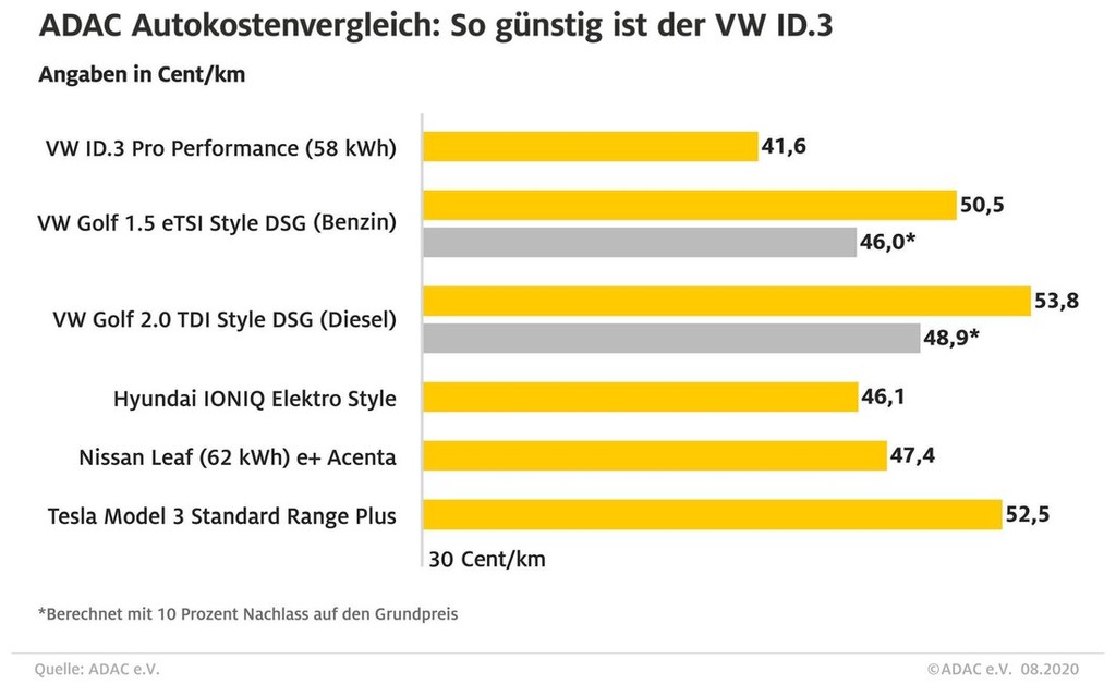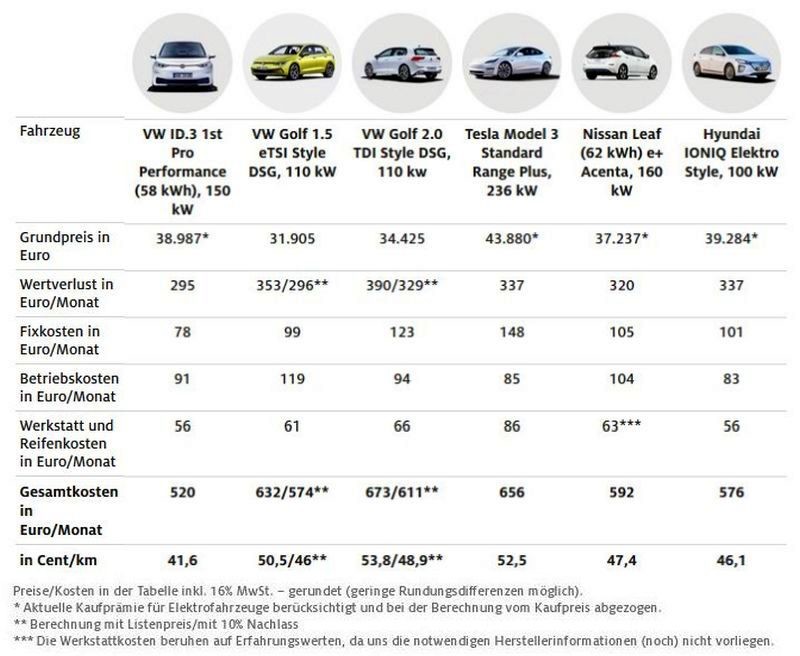 V 'Gesamtkostenrechnung' analizi so seveda upoštevali tudi stroške za nakup pogonskega goriva ali električne energije, motornega olja in aditivov (dizelsko gnana vozila) ter stroške rednega vzdrževanja po treh letih lastništva (odnosno 80.000 prevoženih kilometrov), ko po mnenju Nemcev za večino novejših vozil nastopi čas prvih obveznih obiskov servisov. Upoštevali so še en zelo pomemben faktor v obliki mesečne izgube vrednosti avtomobila in na koncu prišli do dveh presenetljivih ugotovitev, ker se je izkazalo, da je lastništvo striktno električno gnanega avtomobila (takšnega kot je volkswagen ID.3 …) ob upoštevanju vseh omenjenih kriterijev na koncu trenutno resnično cenejše (vsaj v Nemčiji …) od lastništva fosilno gnanega avtomobila. Tudi v tem pogledu je prišlo do presenečenja, ker so dizelsko gnani avtomobili ob upoštevanju vseh faktorjev manj ekonomični in bolj pogubni za vašo mošnjo z denarjem kot pa bencinsko gnano blagohibridno sorodstvo.