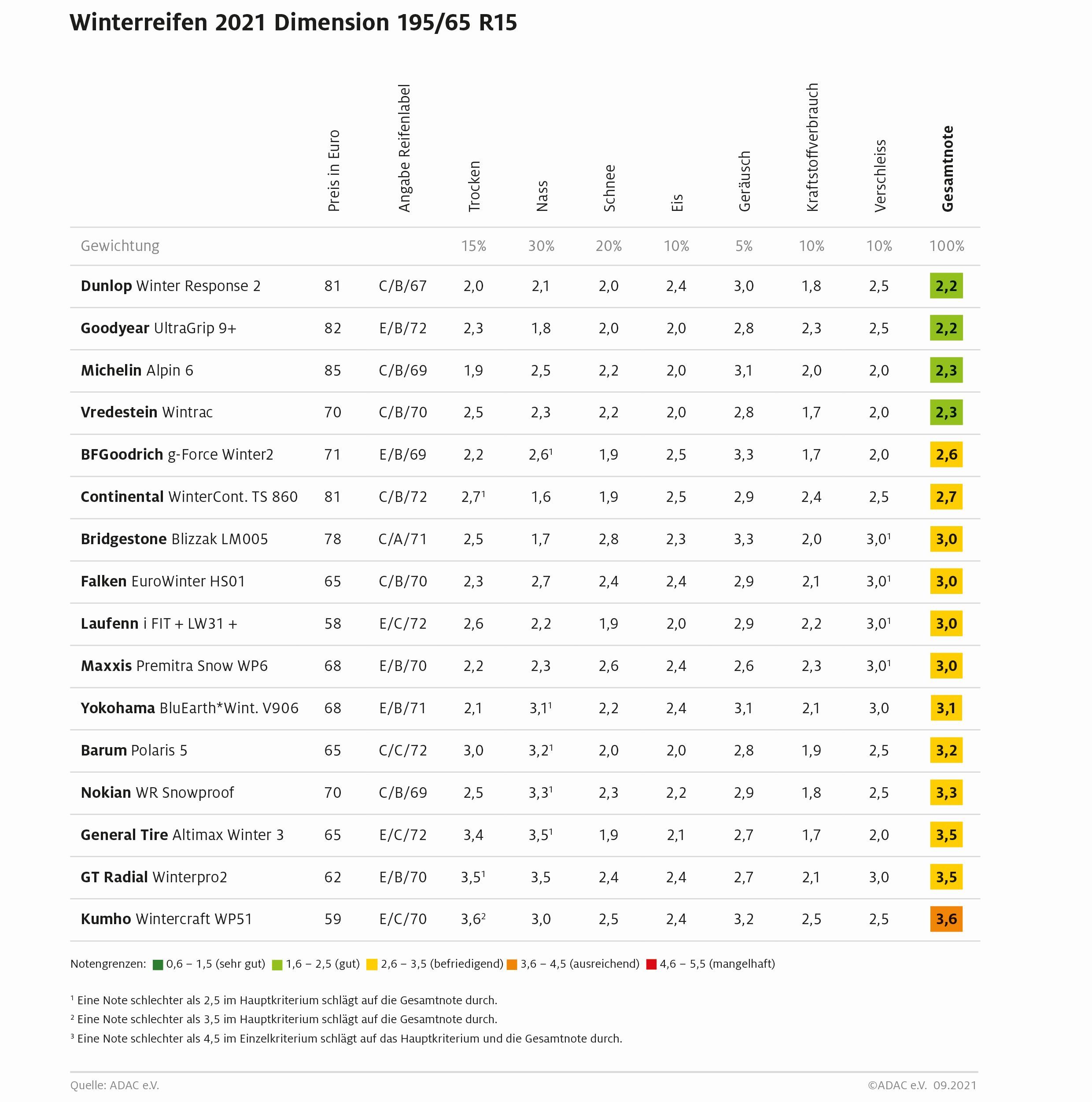 Test manjših (po premeru) in ožjih 15-palčnih zimskih pnevmatik je razkril 4 zmagovalce tega testa, ki nastajajo v obratih znamk Dunlop, Goodyear, Michelin in Vredestein, ter tudi edinega poraženca tega testa v obliki zimske pnevmatike znamke Kumho (tip Wintercraft WP51), ker so Nemci tej zimski pnevmatiki namenili samo oceno „ausreichend“ (zadostno), in to predvsem zaradi njenih slabih voznih lastnosti ob vožnji po suhem in po mokrem. Pri tej pnevmatiki so pohvalili samo njene dobre lastnosti ob vožnji po snegu in ledu, Nemcem je všeč tudi majhen kotalni upor in majhna obraba, posledično je južnokorejska pnevmatika pristala na zadnjem mestu izmed 16 tokrat testiranih 15-palčnih zimskih pnevmatik.