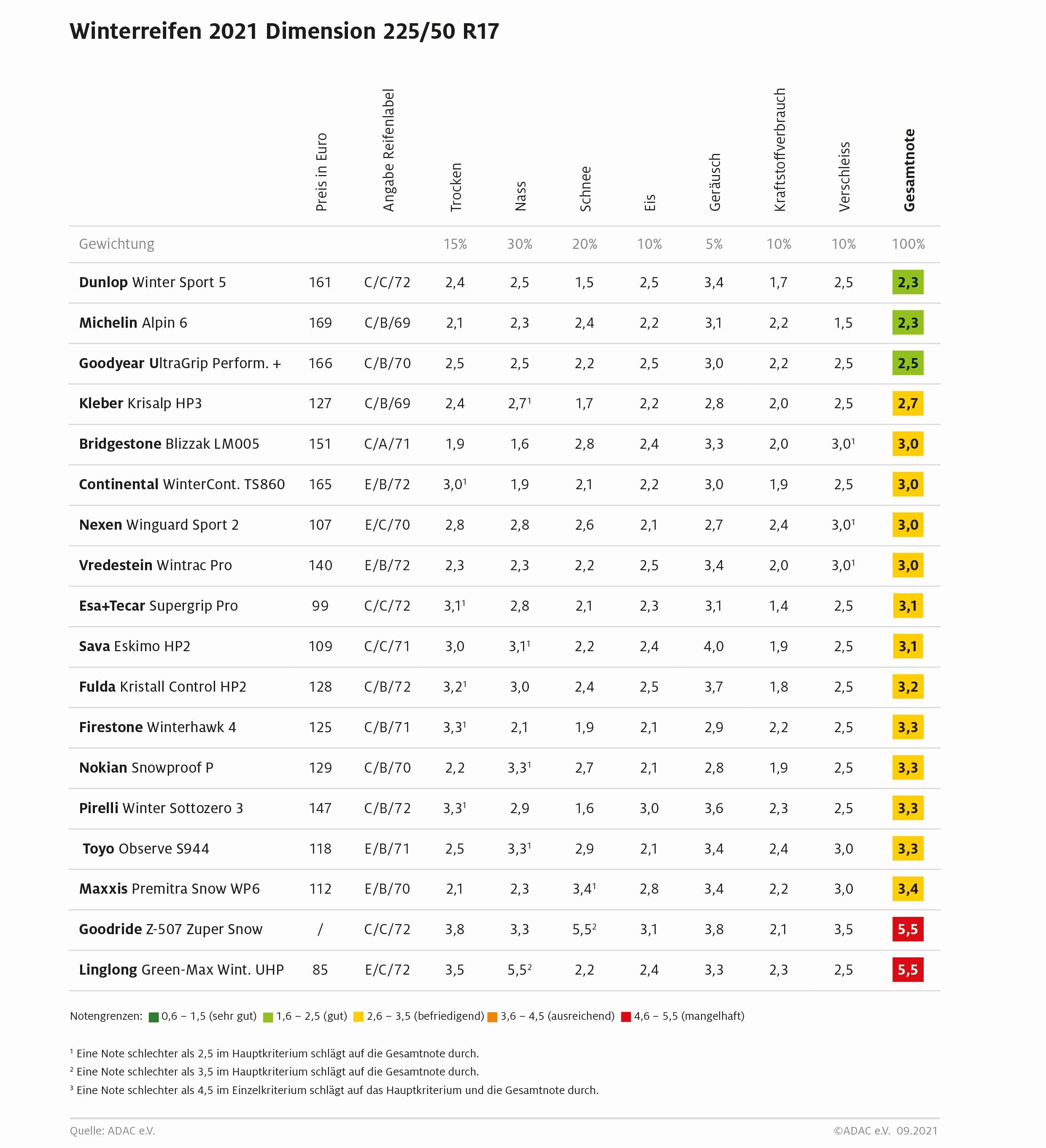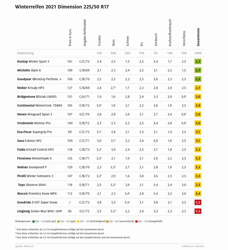 Tudi tokratni veliki nemški test zimskih pnevmatik je postregel z zelo mešanimi ocenami, ker si je oceno „gut“ (dobro) prislužilo samo 7 izmed 34 testiranih zimskih pnevmatik, medtem ko je večina (24 primerkov) testiranih pnevmatik prejela samo oceno „befriedigend“ (zadovoljujoče). Omenjajo pa tudi eno zimsko pnevmatiko z oceno „ausreichend“ (zadostno) in dve zimski pnevmatiki z oceno „mangelhaft“ (pomanjkljivo), ki se jima bodo pametni kupci ob obisku trgovin in vulkanizerjev na daleč izognili, seveda ob predpostavki, da imajo radi sebe, njihove družinske člane in ostale udeležence v prometu …