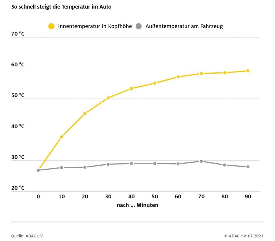 Ta nemški test, ki so ga izvedli z zaprtimi kabinskimi stekli na sredini dneva, je trajal približno 4 ure. Nemci so ob tem ugotovili, da je za nastanek pošteno odmerjene vročine (temperature v območju 50 stopinj Celzija) v notranjosti parkiranega avtomobila potrebnih samo 30 (približno) minut ždenja pod vročim soncem, medtem ko je za nastanek še višjih temperatur (temperature v območju 60 stopinj Celzija) potrebnih približno 60 minut. Kasneje pa temperatura v notranjosti potniške kabine narašča zelo počasi in v majhnih korakih. Ob tem so ugotovili, da na to temperaturo lahko zelo vpliva obarvanost sedežnih prevlek, temnejše ko je sedežno in ostalo oblazinjenje, bolj vroča bo notranjost potniške kabine. Na to temperaturo pa vpliva tudi izbira karoserijske barve.