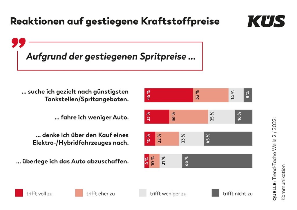 Pri nemški organizaciji KÜS so v teh dneh objavili izsledke skupne (izvedli so jo ob sodelovanju z inštitutom BBE Automotive GmbH) hišne raziskave glede tega, kako so čedalje višje cene fosilnih pogonskih goriv v zadnjem času (april/maj 2022) vplivale na vedenjski vzorec nemških potrošnikov glede avtomobilov.