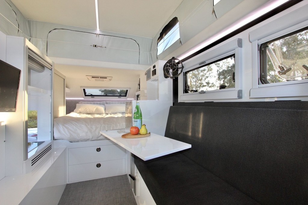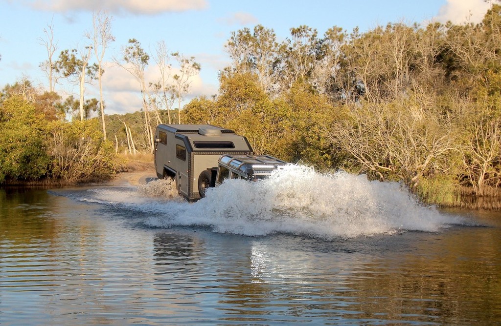 Takšna prikolica, ki lahko ponudi zatočišče šestim osebam, je opremljena z večjim številom raznih filtrov ozračja, parom hladilnikov, kopalnico (tuš) ter tudi s klimatsko napravo, omenjajo pa tudi njeno neprodušnost ob prečkanju vodnih ovir. Zanimiva pa je tudi njena zasnova, ker Avstralci ob tem stavijo na premične 'Outdoor' module (premična kuhinja, zunanje stene in streha). Na začetku verjetno sploh ne bi našli vhoda v takšno prikolico, ker se skriva na sredini zadka pod električno dvižnim pokrovom, ki razkrije tudi pogled na zunanji opcijski pomivalni/pralni stroj. Vse skupaj napaja vgrajena 600 vatna solarna elektrarna, ki s pridobljeno električno energijo oskrbuje vgrajene litij-ionske akumulatorje (380 Ah). Ker je približno 5 metrov dolga bivalna nadgradnja večinoma izdelana iz lahkih, kompozitnih materialov, se lahko takšna prikolica pohvali tudi z relativno nizko maso (680 kg). Evropskim kupcem bo takšna prikolica na voljo šele tekom letošnjega leta. Avstralci pravijo, da bodo pripravili posebno različico takšne prikolice, ki bo ustrezala potrebam in okusu evropskih kupcev …