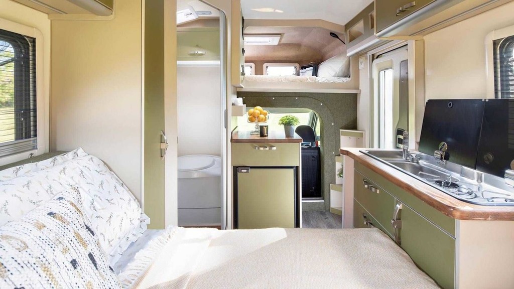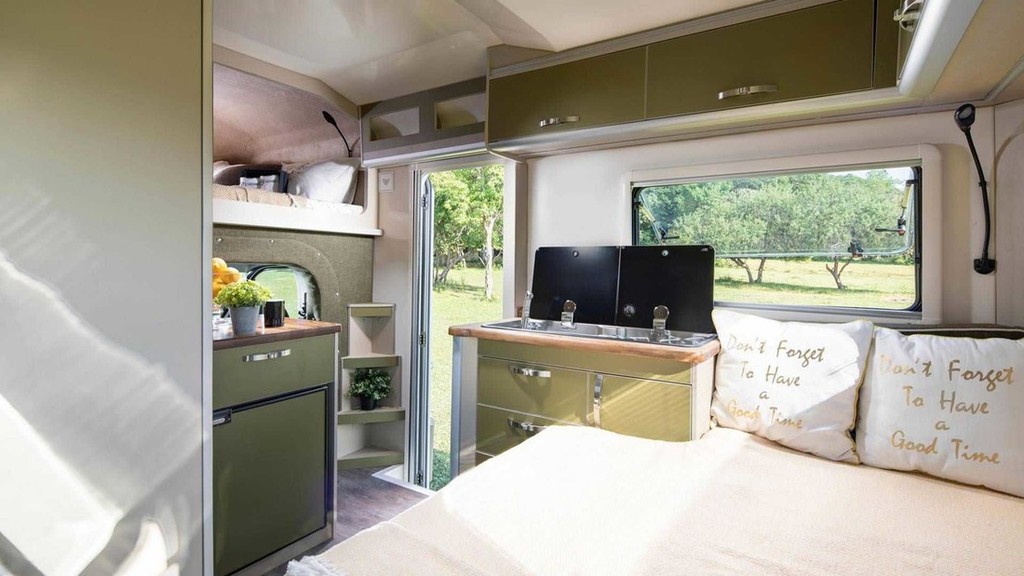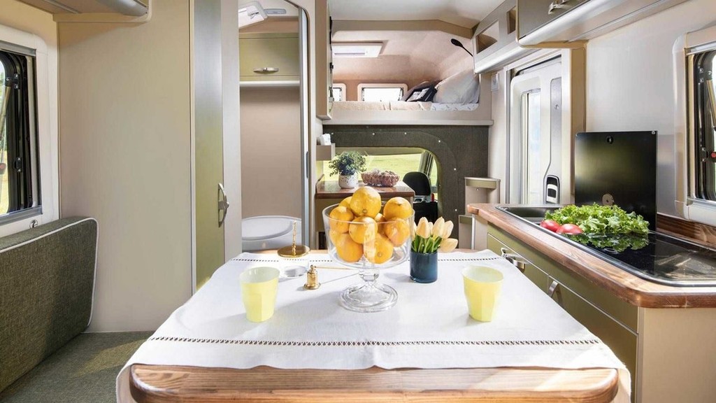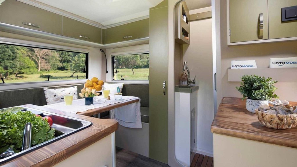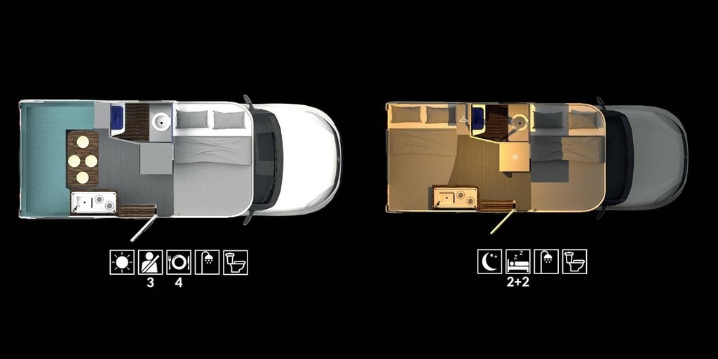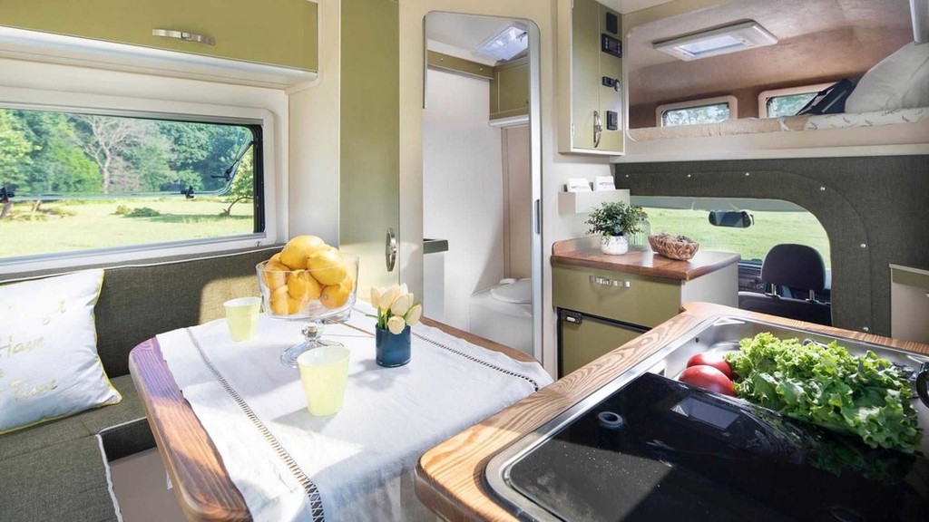 V notranjosti takšnega bivalnika s solidno odmerjenim razmakom (od 182 do 191 cm) med tlemi in stropom lahko na sopotnikovi strani najdete kuhinjski blok z vgrajenim štedilnikom in pomivalnim koritom ter hladilnikom znamke Berhımı (doplačilo, enako velja tudi za grelnik vode znamke Truma) ter pohištvo za shranjevanje živil, omenjajo pa tudi vgrajene sanitarije (kemično stranišče porta potti campingtoilette) in manjši umivalnik ter zunanji tuš). Prostornina vgrajenega rezervoarja pitne vode znaša 88 litrov, nekoliko manjši (50 litrov) je vodni rezervoar za splakovanje. Za voznikom se nahaja tudi zunanji priključek za vodo. Za spanje imajo štirje uporabniki na voljo dve različno veliki postelji (190 x 120 cm in 190 x 135 cm), čeprav se v vozilu med vožnjo lahko nahajajo samo trije potniki. Ostalo možno opremo (klimatska naprava, dodatni grelec, solarne celice na strehi, močnejši akumulator, 'infotainment' sistem) je potrebno doplačati.
