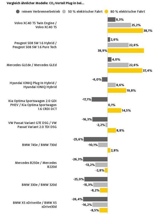 Najbolj zavidljiv napredek v pogledu negovanja pravih ekoloških vrednost zagovarja in dokazuje izdelek (XC40 T5 Twin Engine) znamke Volvo, ker je ob direktni primerjavi z običajnim sorodstvom (XC40 T5) dejansko manj potraten z gorivom, posledično boste že ob vožnji z vgrajenim bencinskim motorjem ustvarili 8,3 odstotka manj CO2 emisij, odnosno 25,2 odstotka manj emisij v hibridnem (50%) pogonu. Takšen volvo se lahko pohvali tudi s procentualno najvišjim odmerkom (38,1) znižanja škodljivih CO2 emisij med vsemi testiranimi avtomobili. Na drugem, povsem nasprotnem koncu lestvice najdemo bavarsko 'lifestyle-lokomotivo' z oznako X5 xDrive45e, ki sodi med tokratni 'Trio Fantastikus' (družbo mu delata še BMW 330e in mercedes-benz B250e), ker so to avtomobili, ki ob vožnji niti pod razno niso sposobni ustvariti manj CO2 emisij od klasično gnanih sorodnikov.