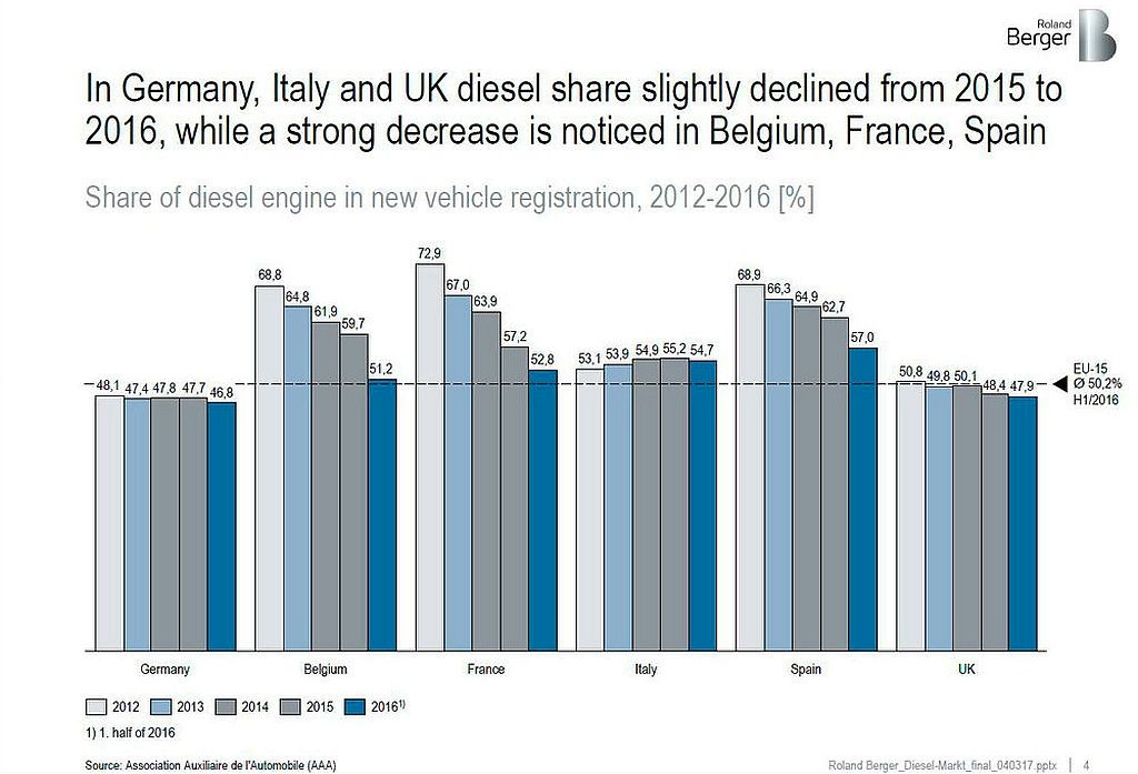 V zadnjih petih letih se največ sprememb na tržišču novih vozil odvilo v Franciji in Belgiji, ker se je število kupcev, ki so si omislili nova dizelsko gnana vozila, znižalo za približno 20 odstotkov. V Nemčiji so imeli dizelsko gnani avtomobili leta 2012 48,1 odstotni tržni delež, na začetku lanskega leta se je ta delež nekoliko znižal in zdrknil na 46,8 odstotka. Manj novih dizelsko gnanih vozil so si v zadnjih petih letih omislili tudi Španci, malenkostno več so jih kupili Italijani. Napovedi podjetja Roland Berger predvidevajo nadaljnji upad popularnosti dizelsko gnanih avtomobilov do leta 2030. Po njihovem mnenju bodo že do leta 2020 iz evropskih prodajnih salonov izginili vsi novi dizelsko gnani predstavniki evropskega A segmenta (majhni (mini) avtomobili), medtem ko naj bi delež novih dizelsko gnanih 'superminijev' (evropski B segment) takrat znašal največ 30 odstotkov in se do leta 2030 skrčil na nepomembnih 5 odstotkov.