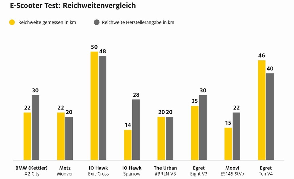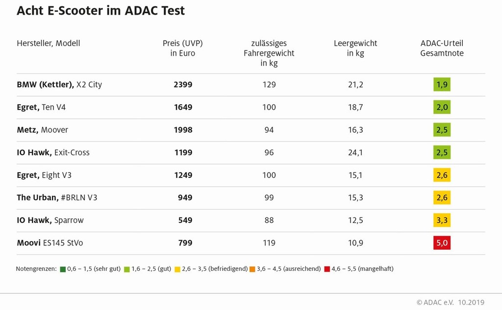 Pravi zmagovalec tega testa je izdelek znamke BMW (Kettler), ker je prepričal strokovnjake z odlično kvaliteto izdelave ter z varnostnimi lastnostmi (velika kolesa …), ki mu zagotavljajo tudi dobre vozne lastnosti. Med slabostmi pa omenjajo edino preveliko maso takšnega skiroja ter nenavadno upravljanje, ki se ga mora lastnik pač navaditi. Omenili pa so tudi zmagovalca (The Urban #BRLN V3, nemška prodajna cena: 949 evrov) v pogledu plačanega in dobljenega ('Preis-Leistungs-Sieger'). Podobno oceno ('befriedigend' - zadovoljujoče) oceno sta prejela še dva električna skiroja (relativno drag egret eight V3 (1249 evrov) & zelo poceni IO hawk sparrow (549 evrov)).