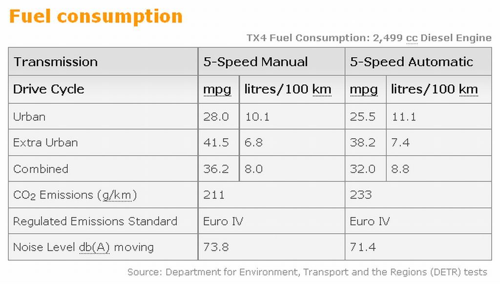 Novo transportno sredstvo je zelo priljubljeno med prebivalci kosovske prestolnice, ker po njihovem mnenju prinaša v mesto delček svetovljanstva, poleg tega pa so navdušeni tudi nad razkošno odmerjenim prostorom in udobjem, ki ga ponuja ta načrtno razviti britanski taksi. Pod motornim pokrovom modela TX4 se skriva 2,5-litrski turbodizelski izdelek italijanske znamke VM Motori z oznako R 425 DOHC, ki je lahko spojen s 5-stopenjskim ročnim (Eaton 5-speed (FSO 2405 A)) ali pa s 5-stopenjskim samodejnim menjalnikom. Motorja sicer res ne razganja od moči, ker ustvari samo 102 KM pri 4000 vrt./min ter 240 Nm navora pri 1800 vrt./min, namesto tega se bo uporabniku raje oddolžil z dolgoživostjo, ker je pogonski sklop izveden in testiran tako, da zdrži do 600.000 (približno 965.000 km) prevoženih kopenskih milj.