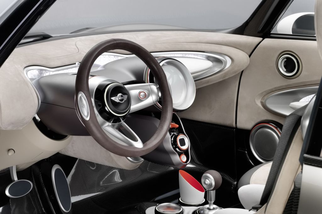 Podobno se odpira tudi par bočnih vrat, ki omogočijo dober dostop do razkošno izvedene notranjosti, kjer se prepletata tradicija in morebitna bodočnost znamke MINI. Ta je namenjena mladim, vsaj v primeru tega koncepta, ker je centralno nameščeni komandni modul izveden v premični maniri, ki omogoča njegovo odstranitev in priklop na domači računalnik v primeru, ko želi uporabnik pred potovanjem osvežiti navigacijske ali druge informacije. Študija rocketman, ki naj bi ob premagovanju stotih kilometrov popila samo 3 litre goriva, počiva na 18-palčnih lahkih platiščih.