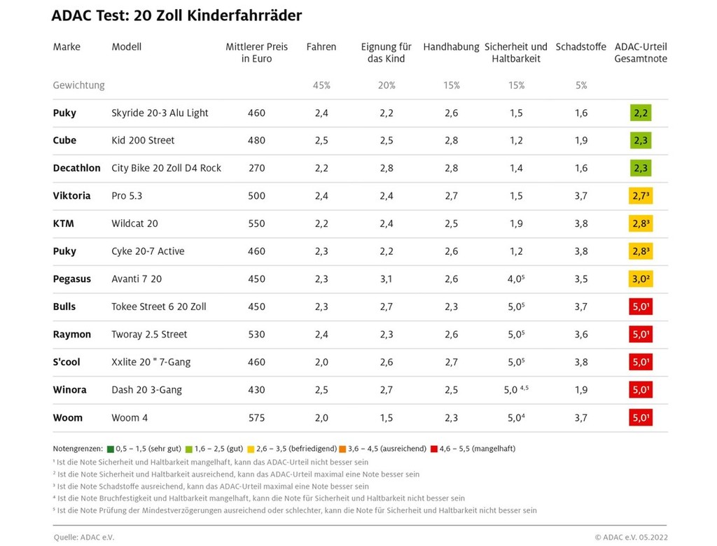 Tudi tokrat so Nemci za ocenitev testnih kandidatov uporabili 5 testnih kriterijev (občutek pri vožnji, primernost kolesa za otroke, priročnost, varnost in dolgoživost izdelka, uporaba škodljivih sestavnih materialov). Na koncu so najbolje ocenili izdelek znamke Puky (model Skyride 20-3 Alu Light, nemška prodajna cena: 460 evrov), ker je primerno lahek (masa: 12 kilogramov) za otroka, poleg tega je ta model z lahkoto opravil vse teste. Hvalijo pa tudi zasnovo nosilnega okvirja, ker lahko otrok na takšno otroško kolo zleze z lahkoto (seveda to velja tudi za obraten postopek …) in pa prestavna razmerja pri pritaknjenem 3-stopenjskem 'menjalniku'. Podobno dobro (ocena 'gut' (dobro)) so ocenili tudi izdelek znamke Cube (model Kid 200 Street, 480 evrov). Pri tem izdelku hvalijo predvsem njegovo robustnost.