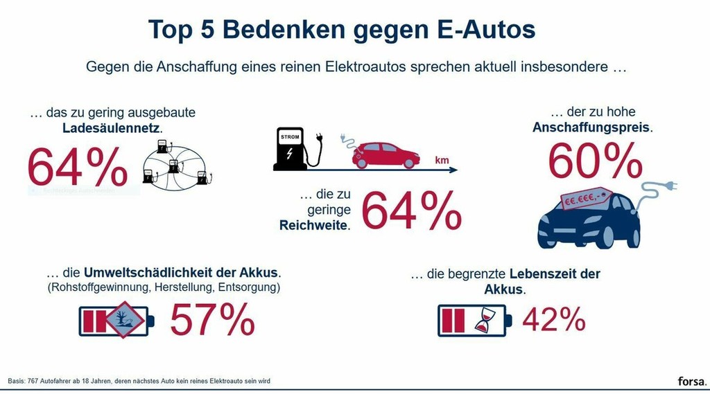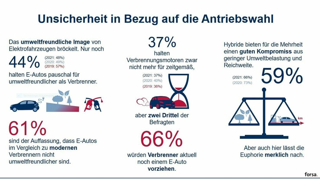 V zadnjih treh letih (2019-2022) kopni tudi okoljevarstveni ugled striktno električno gnanih avtomobilov. Ko so Nemci leta 2019 izvedli podobno raziskavo, je bilo 57 odstotkov izmed vseh vprašanih mnenja, da so električni avtomobili bolj 'zeleni' kot klasično (fosilno) gnani avtomobili. Letos se s to trditvijo strinja samo še 44 odstotkov izmed vseh vprašanih. 61 odstotkov izmed vseh, ki so sodelovali v letošnji raziskavi, je celo prepričanih, da je napredek (v pogledu ekologije …) v razvoju modernih bencinskih motorjev že tako velik, da električna vozila ne predstavljajo več nobene resne alternative. 57 odstotkov je ob tem omenilo hude posledice za okolje ob pridobivanju materialov za izdelavo akumulatorjev, 42 odstotkov izmed vseh vprašanih je zaskrbljenih nad kratkoživostjo vgrajenih akumulatorjev, 64 odstotkov izmed vseh vprašanih pa meni, da imajo električni avtomobili še vedno premajhno avtonomijo s samo enim polnjenjem akumulatorjev, poleg tega je trenutno omrežje polnilnic enostavno premajhno za splošni razcvet elektromobilnosti. Za 60 odstotkov izmed vseh vprašanih Nemcev in Nemk pa so največja ovira visoke prodajne cene električnih avtomobilov.