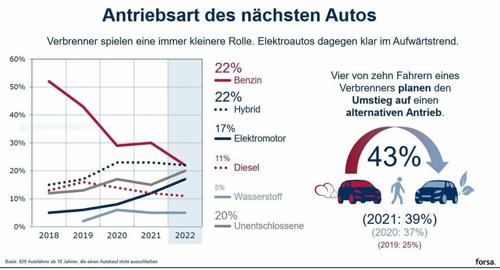 Zanimanje nemških potrošnikov (v tokratni raziskavi je v odgovorih na različna vprašanja sodelovalo od 767 do 929 Nemcev in Nemk, ki so starejši od 18 let) za alternativno gnana vozila konstantno narašča, ker bi se za nakup alternativno gnanega vozila letos odločilo 43 odstotkov (4 odstotne točke več kot leta 2021) izmed vseh, ki so sodelovali v tej raziskavi, skoraj nespremenjeno pa ostaja zanimanje kupcev za hibridna vozila (takšno vozilo bi si omislilo 22 odstotkov izmed vseh vprašanih). Občutno (iz 8 na 17 odstotkov) se je v zadnjih dveh letih (2020-2022) povečalo zanimanje kupcev za striktno električno gnana vozila, medtem ko nakup bencinsko gnanega avtomobila podpira samo še 22 odstotkov izmed vseh vprašanih. Še slabše kaže dizelsko gnanim avtomobilom, ker bi se za nakup 'traktorja' trenutno odločilo samo še 11 odstotkov izmed vseh, ki so sodelovali v tej raziskavi. 20 odstotkov izmed vseh vprašanih pa sploh ne ve, kakšen pogon bo imelo njihovo naslednje vozilo. Zelo veliko vprašanih pa podpira tudi uvedbo sintetičnih 'E-Fuel' goriv, ki jih marketing predstavlja kot goriva brez CO2 emisij. V resnici tako gnan avtomobil ob vožnji še vedno ustvarja CO2 emisije, brez CO2 emisij pa naj bi potekala samo proizvodnja takšnega goriva, ki pa je trenutno enostavno predrago (poznavalci ob tem omenjajo prodajno ceno v območju osmih evrov za en liter …).