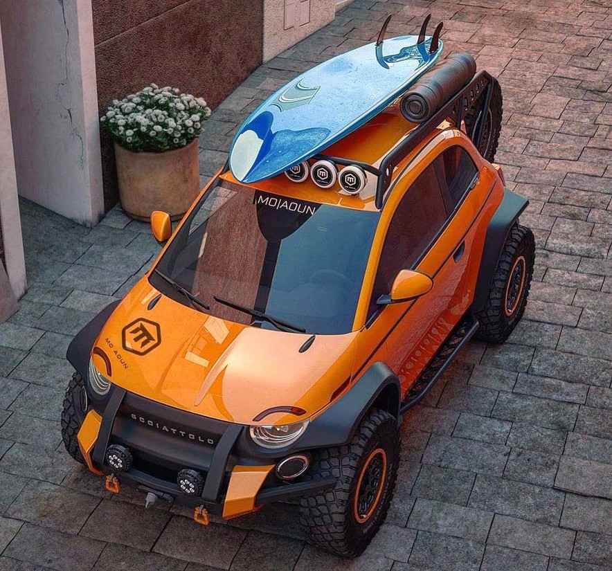 Na to karto igra tudi tržno izredno uspešni suzuki jimny, ki ga poznajo po celem svetu. Obstaja pa tudi legendarna panda 4x4 (1983-1998), lahek terensko prehodni avtomobil, ki ima v določenih regijah sosednje Italije že dolgo kultni status, ker se s takšno SUV pando lahko pripeljete skoraj kamorkoli. Sedaj je pred nami rahlo utopični fiat 500 'Scoiattolo', ki ga je na njegovem Instagram profilu predstavil oblikovalec s preprostim imenom moaoun. Ta človek očitno dobro pozna italijansko SUV zgodovino, ker je za terensko orientiranega fiata 500 uporabil dodatno modelno oznako 'Scoiattolo', ki je dobro znana samo pravim poznavalcem italijanske avtomobilske industrije, podobno kot oznaki 'Cavaletta' in 'Minimaxi', ki ju povezujemo z nekdanjimi prostočasnimi različicami prvotnega fiata 500 in fiata 126, sicer spiritualnega naslednika originalnega fiata 500.