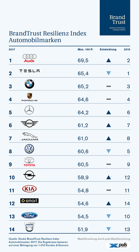 Tudi za usodo znamke Volkswagen se nam ni treba bati, ker je to še vedno avtomobilska znamka, ki ji v Nemčiji zaupa največ kupcev. Kljub temu lahko govorimo o nekoliko nižji odpornosti te avtomobilske znamke na izgubo ugleda, ker je letos zdrknila iz petega (2015) na osmo mesto lestvice, kjer se je znašla 'v senviču' med znamkama Jaguar in Toyota. Za nižji rating znamke Volkswagen je poskrbela predvsem manjša sposobnost znamke na implementacijo bodočih tehnologij, v tem pogledu sta za to znamko uvrščeni samo še znamki Ford in Dacia. Hujši padec znamke Volkswagen na tej lestvici je preprečen še iz enega razloga, Nemci mu pravijo 'Markenverbundenheit' (tradicionalna navezanost nemških kupcev na znamko Volkswagen). Zanimiva je tudi letošnja uvrstitev znamke Tesla, ker je v očeh nemških kupcev izgubila primat zelo inovativne in tehnično zelo solidne avtomobilske znamke, predvsem zaradi tega, ker Nemci kot praktičen narod prisegajo na realnost, ob tem pa ostajajo hladni glede bogatih borznih donosov ter obljub raznih 'prerokov' tipa Elon Musk.