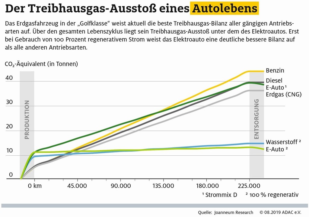 V nemško raziskavo so vključeni celotni življenjski cikli (od 'rojstva' do 'smrti') približno 15 let, različno gnanih avtomobilov iz 'golfovega' razreda (evropski C segment), ki letno prevozijo povprečnih 15.000 kilometrov. Nemci so ob sodelovanju z akademskim partnerjem (JOANNEUM RESEARCH Forschungsgesellschaft mbH) primerjali količine toplogrednih emisij, ki nastanejo ob izdelavi, uporabi in recikliranju takšnih avtomobilov, istočasno so izračunali tudi količino emisij, ki nastanejo pri proizvodnji, distribuciji in porabi pogonskih goriv (bencin, dizel in plin) ter električne energije. Rezultati te raziskave ne bodo všeč simpatizerjem električnih avtomobilov, ker so Nemci po teh kriterijih ugotovili, da si laskavi naslov pravega ekološkega avtomobila resnično zaslužijo samo avtomobili na plinski pogon (stisnjen zemeljski plin (CNG) in utekočinjeni naftni plin (LPG)), ker električni avtomobil po takšnih kriterijih ni prav nič bolj ekološki od dizelsko gnanega avtomobila.