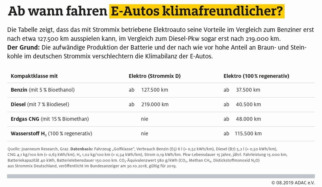 V teh dneh so pri nemškem klubu ADAC izdali poročilo, ki dokončno razbija mit o trenutnem okoljevarstvenem potencialu električnih avtomobilov, ker so številni strokovnjaki že pred časom ugotovili, da je realizacija takšnega mita možna samo ob 100-odstotnem izkoriščanju obnovljivih virov (hidroelektrarne, solarne in vetrne elektrarne) električne energije.