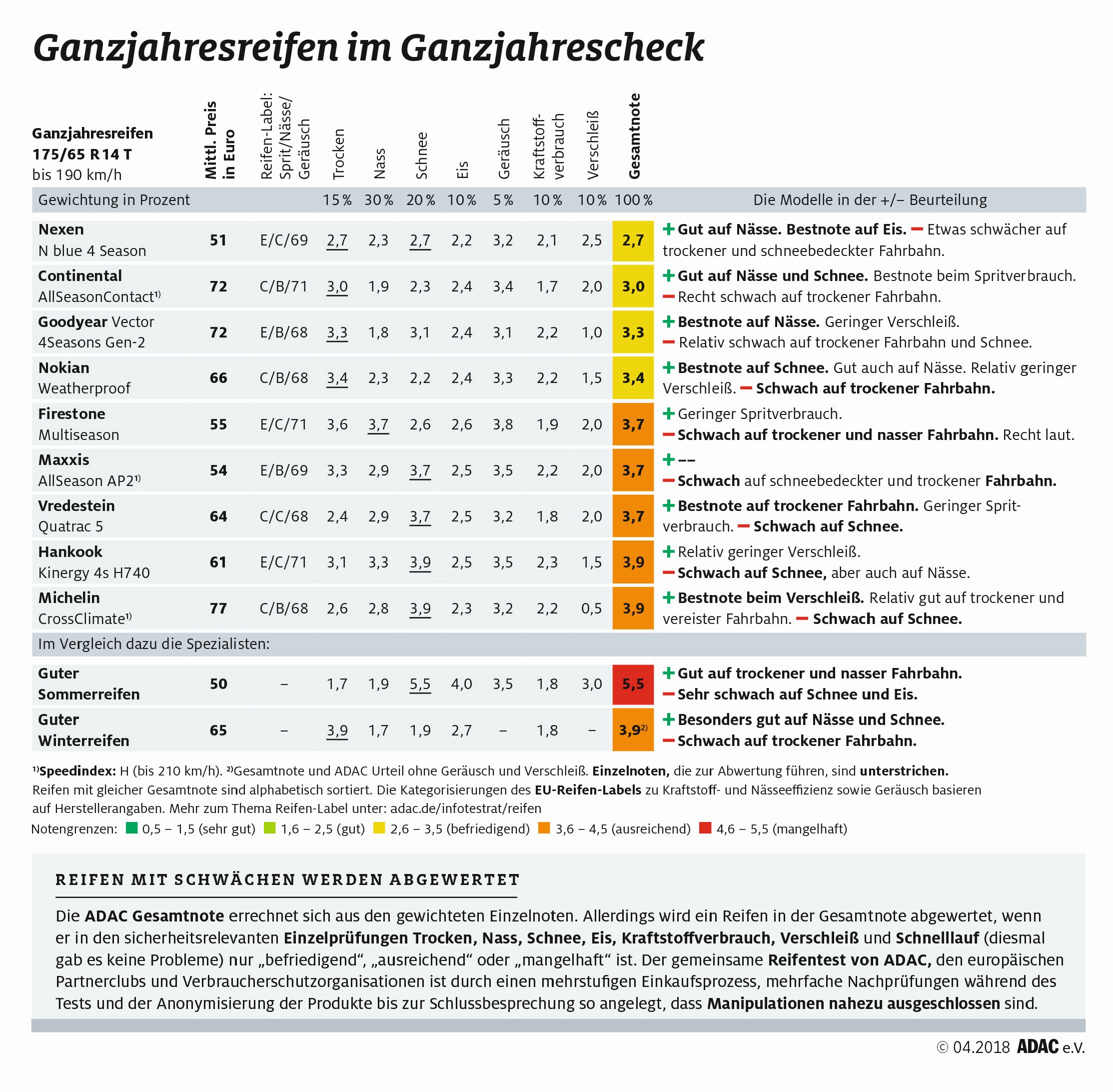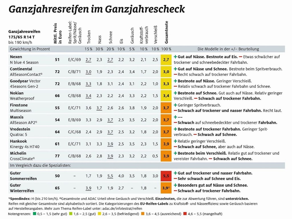 Na tokratnem testu je v vseh pogledih blestela predvsem celoletna pnevmatika znamke Nexen (tip N blue 4 Season), ker se lahko pohvali z najboljšimi rezultati (zelo uravnotežena pnevmatika ne glede na vrsto vozne podlage, malenkostno slabša je le ob vožnji po ledu in snegu) ter izredno ugodno prodajno ceno (nemška prodajna cena: 51 evrov za kos). Največje razočaranje pa predstavlja uvrstitev celoletne pnevmatike premium znamke Michelin (tip CrossClimate), ker je najdražja (77 evrov za kos) tokrat testirana pnevmatika na koncu pristala na zadnjem mestu.
