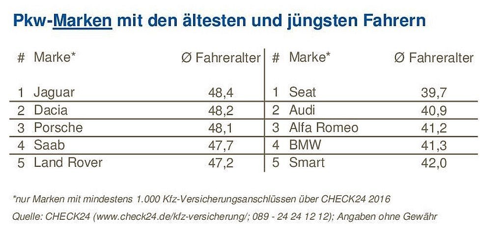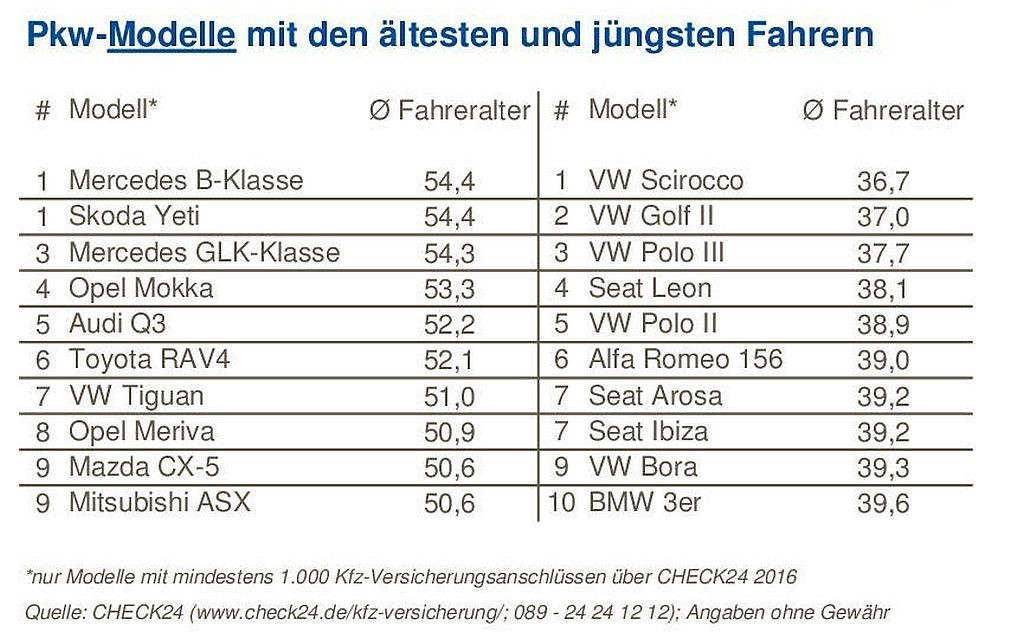 Zato imajo nemški lastniki klasičnega kombikupeja kot je volkswagen scirocco za sabo samo povprečnih 36,7 let življenja, 'bestagerji' (dobrohotna marketinška oznaka za upokojence) pa prisegajo na vozila kot je ljudski mercedes-benz iz razreda B ter Škodin yeti. V to družbo idealnih vozil za upokojence, kjer ima povprečni lastnik za sabo od 54,3 do 54,4 let življenja, spada še modni mercedes-benz GLK ter ostala modna SUV in 'crossover' (oblikovni križanec) populacija. Mlajši kupci se raje odločijo za nakup Volkswagnovega golfa ali modela polo. Zanimivo je tudi razkritje najstarejših lastnikov po avtomobilskih znamkah. V tem pogledu imajo 'najstarejši vozni park' pri znamki Jaguar (povprečna starost lastnika: 48,4 let), največ mladih Nemcev in Nemk se odloči za nakup vozila znamke SEAT (39,7 let).