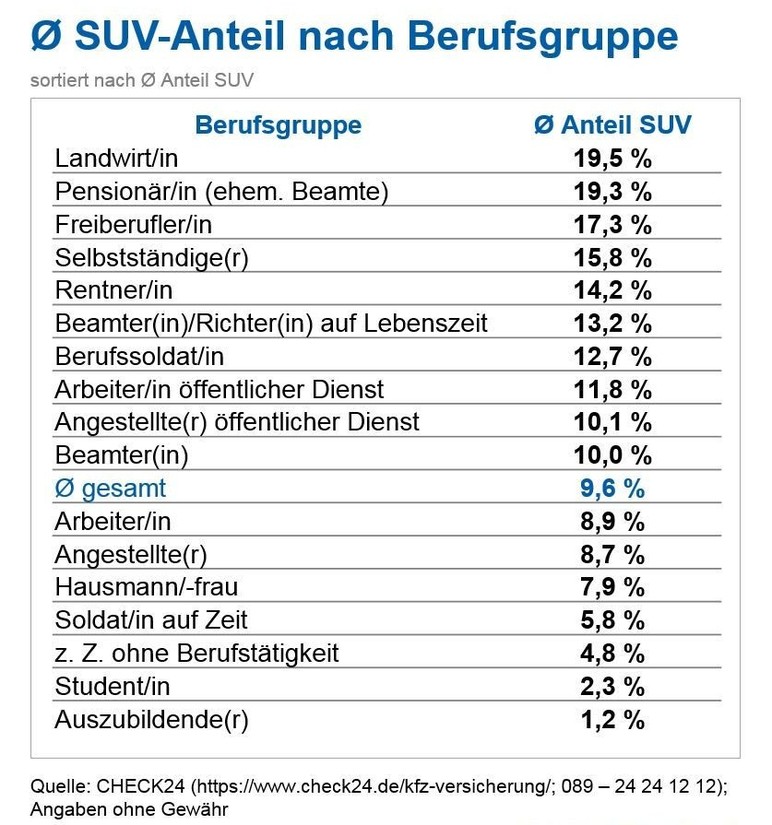 Vas zanima, kaj imajo v teh časih skupnega nemški kmetovalci in upokojenci? Skupna jim je predvsem brezpogojna ljubezen do SUV vozil, ki so v Nemčiji znana tudi kot 'Senioren und Veteranen-Auto' (avtomobil za upokojence in veterane). To navedbo potrjuje tudi zadnja raziskava portala CHECK24, kjer so ugotovili, da imajo kmetje v nemški lastniški populaciji SUV vozil 19,5 odstotni delež. Tesno za petami (19,3 %) so jim nekdanji nemški javni uslužbenci (upokojenci). K temu pa morate prišteti še delež (14,2 %) nemške skupine prebivalcev, ki ji Nemci pravijo 'Rentner' (upokojenec, ki ni bil zaposlen v javnem sektorju), zato je prej omenjeno nemško tolmačenje besede SUV zelo primerno …