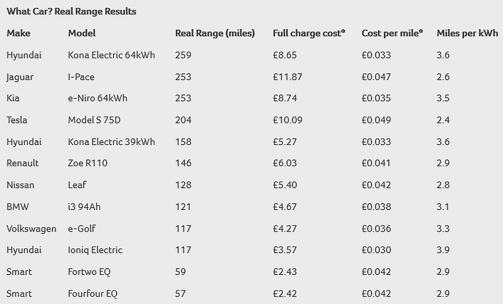 Ker se tudi v Veliki Britaniji povečuje interes kupcev glede nabave striktno električno gnanih avtomobilov so novinarji revije What Car? uvedli nova testiranja električnih avtomobilov, ki so izvedena po vzoru že znanih 'True MPG' testov, kjer razkrivajo dejansko povprečno porabo fosilno gnanih avtomobilov.