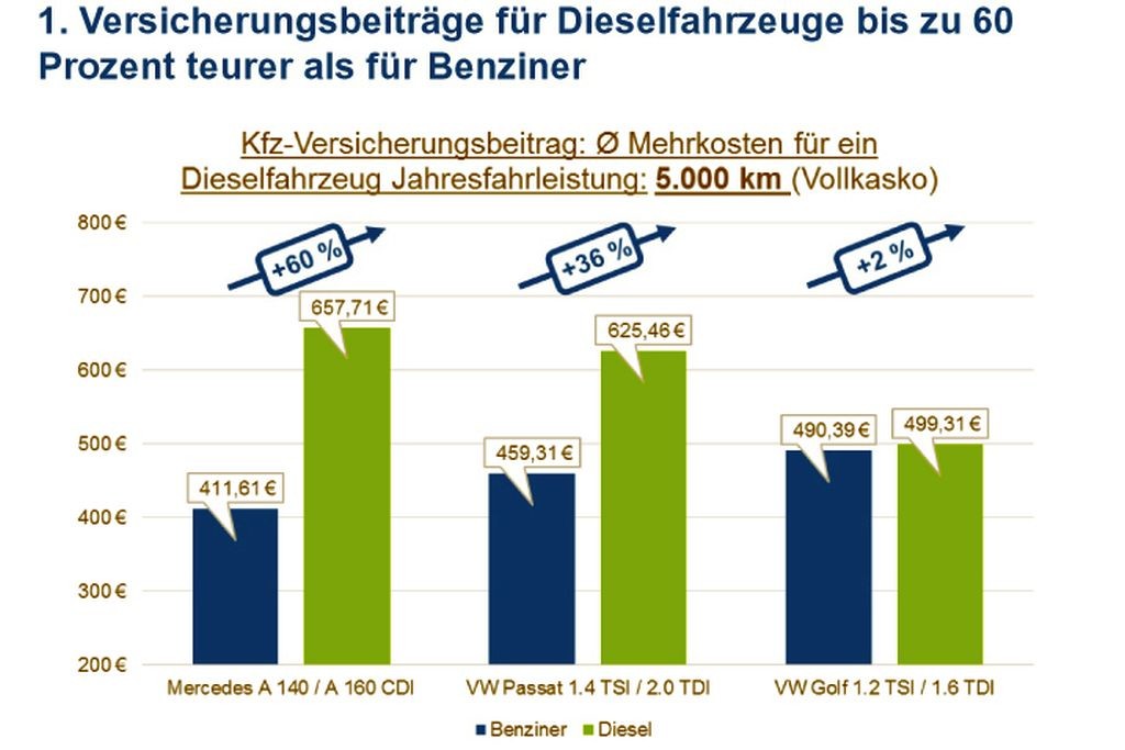 Edino svetlo točko za lastnike dizelsko gnanih vozil je razkrila primerjava med dizelsko in bencinsko gnanim golfom (1.6 TDI & 1.2 TSI), vendar samo v primeru, ko lastnik Volkswagnovega modela v enem letu prevozi od 15000 do 30000 kilometrov. V tem primeru bo lastnik za obvezno zavarovanje odštel približno 2 odstotka manj (približno 18 evrov) kot lastnik bencinsko gnanega golfa. Za osnovo pri tej raziskavi so Nemci uporabili 10 aktualnih serijskih modelov osebnih avtomobilov z vgrajenimi dizelskimi in bencinskimi motorji, ki ponujajo uporabnikom identične zaloge pogonske moči.