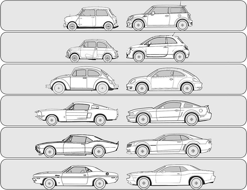 V današnjih časih obstaja kar nekaj serijskih modelov različnih proizvajalcev avtomobilov, ki so oblikovani kot novodobne kopije slavnih štirikolesnih predhodnikov. V Evropi v tem pogledu prednjačijo predvsem tri avtomobilske znamke (Fiatova družina modela 500 in novi fiat 124 spider, modelna paleta znamke MINI in Volkswagnov novi 'hrošč'), svoj piskrček pri nastajanju sodobnega 'retro gibanja' so v teh časih pristavile tudi tri severnoameriške avtomobilske znamke (Chevrolet, Dodge in Ford), ki so ob tem oživile tri slavne ameriške 'mišičnjake' (camaro, challenger in mustang). V večini evropskih 'retro' primerkov gre za avtomobile, ki z ljudskimi predhodniki poleg oblike nimajo več veliko skupnega, ker so njihove moderne interpretacije namenjene drugačnim kupcem, predvsem tistim, ki cenijo stil in individualnost, ker je to pač pojem, ki je tesno povezan s prestižem (pravi premium izdelek ni parkiran na vsakem mestnem vogalu …). V primeru novega fiata 124 spider in prej omenjenih novodobnih ameriških 'mišičnjakov' se poslanstvo teh avtomobilov ni prav nič spremenilo, ker so že njihovi predhodniki odražali in utelešali vse (športnost, eleganco in prestiž) kar cenimo tudi pri njihovih sodobnih kopijah.