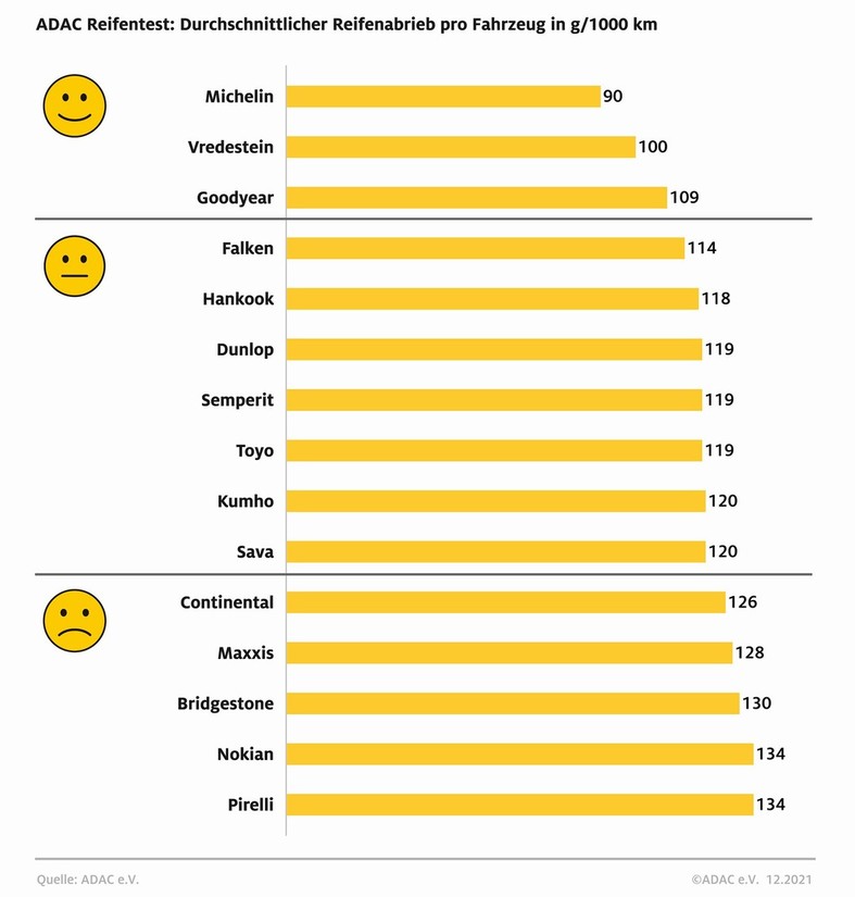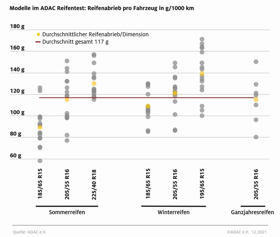 Kot primer so Nemci navedli letno pnevmatiko znamke Bridgestone v dimenzijah 185/65 R15, s katero boste ob vožnji ustvarili samo 58 gramov obrabe na vsakih 1000 prevoženih kilometrov. Vendar pa na obrabo ne vpliva samo dimenzija pnevmatike, temveč tudi njena namembnost. Lep primer tega je še en izdelek znamke Bridgestone v obliki (dimenzije: 195/65 R15) zimske pnevmatike (model Blizzak LM005), ki ima občutno večjo obrabo (171 g/1000 km) kot podobno dimenzionirana letna pnevmatika te znamke. Zelo veliko obrabo pa imajo tudi izrazito športno usmerjene pnevmatike, recimo v dimenzijah 225/40 R18. Pri takšnih pnevmatikah je obraba v obliki izgubljenih 160 gramov na vsakih 1000 prevoženih kilometrov nekaj povsem običajnega. Dr. Reinhard Kolke (vodja testnega centra ADAC) je ob tem popolnoma jasen, ker pravi, da je modni trend v obliki čedalje večjih (po premeru in širini) in čedalje nižjih (po preseku) pnevmatik popolnoma skregan z ekologijo, seveda pa ta ugotovitev velja tudi za neverjetno 'ekološke' električne avtomobile, ki so vsi po vrsti izredno dobro rejeni (povprečna masa takšnih lažnih okoljevarstvenikov z izpušnimi cevmi v termoelektrarnah znaša približno 2 toni …) in posajeni na ogromne pnevmatike …